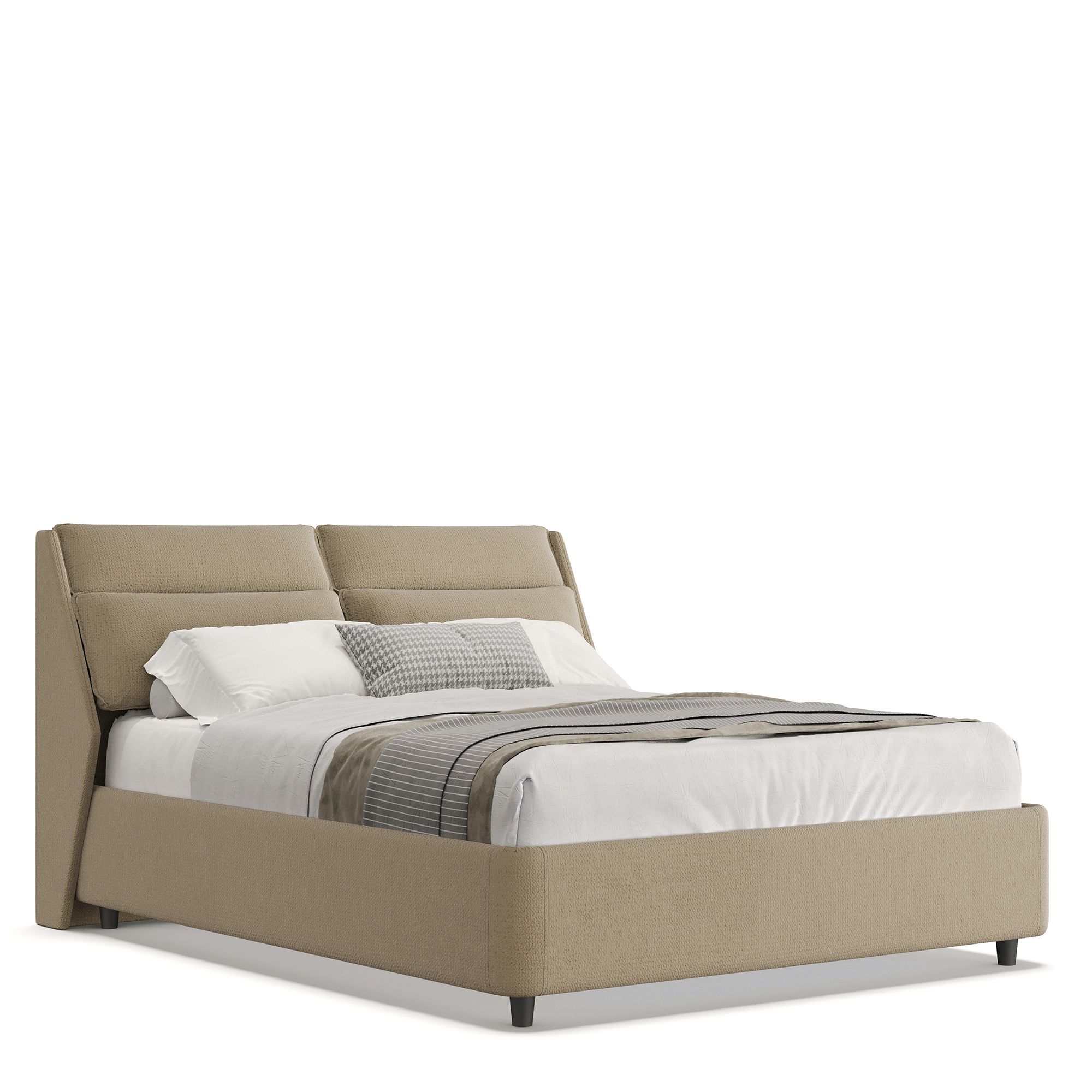 Кровать TEWIN выполнена в полностью мягком текстильном корпусе из рогожки, а ее изголовье оснащено необычными подушками, расположенными под углом, чтобы на них было удобно облокотиться, отдыхая за чтением или просмотром сериала. Скругленные углы основания обеспечивают безопасность использования, а дизайн с высокими ножными опорами не создает препятствий при уборке с помощью робота-пылесоса. Модель оснащена надежным подъемным механизмом и вместительным ящиком для белья. Металлическое основание и ортопедическая решетка (каркас – металл) входят в комплектацию.