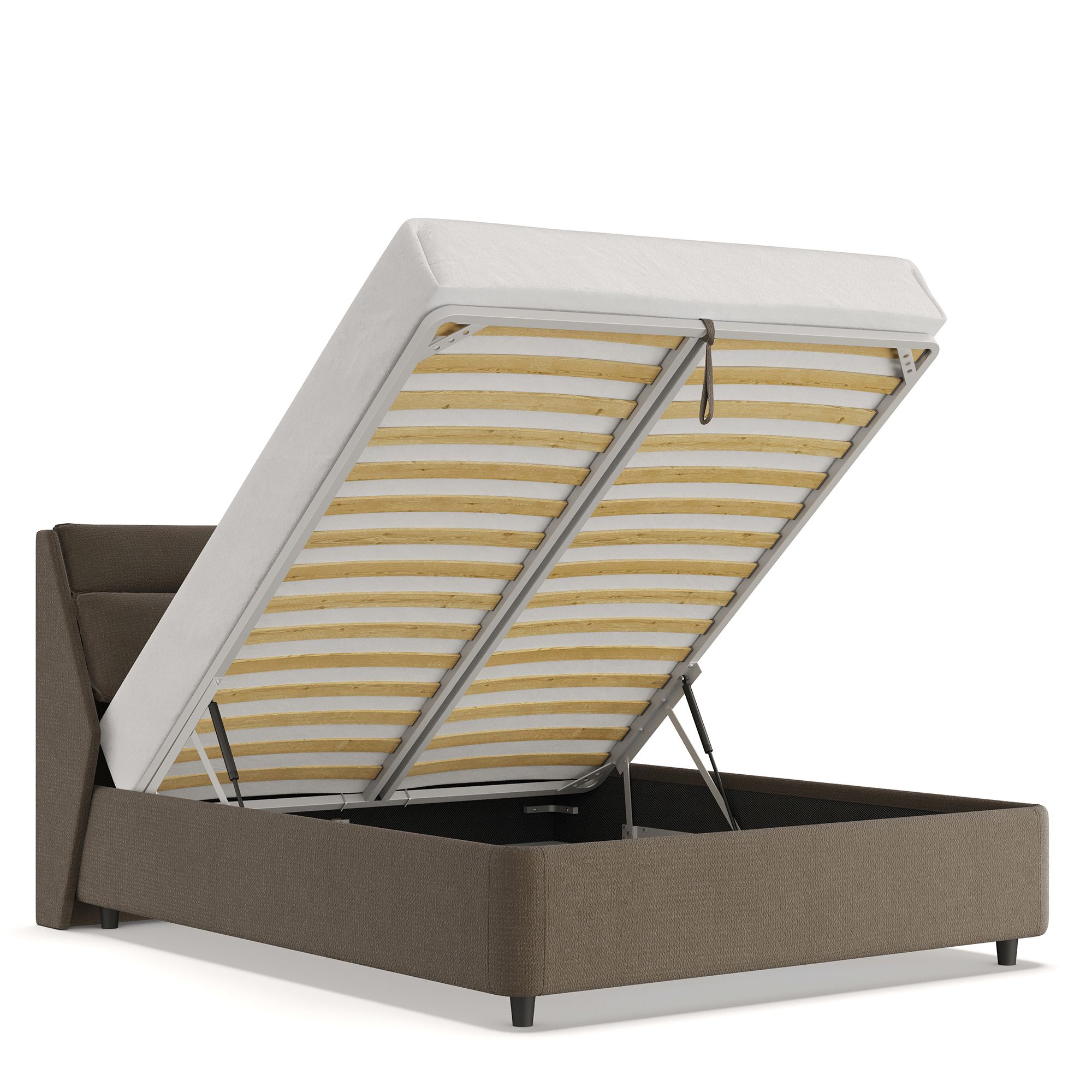 Кровать TEWIN выполнена в полностью мягком текстильном корпусе из рогожки, а ее изголовье оснащено необычными подушками, расположенными под углом, чтобы на них было удобно облокотиться, отдыхая за чтением или просмотром сериала. Скругленные углы основания обеспечивают безопасность использования, а дизайн с высокими ножными опорами не создает препятствий при уборке с помощью робота-пылесоса. Модель оснащена надежным подъемным механизмом и вместительным ящиком для белья. Металлическое основание и ортопедическая решетка (каркас – металл) входят в комплектацию.