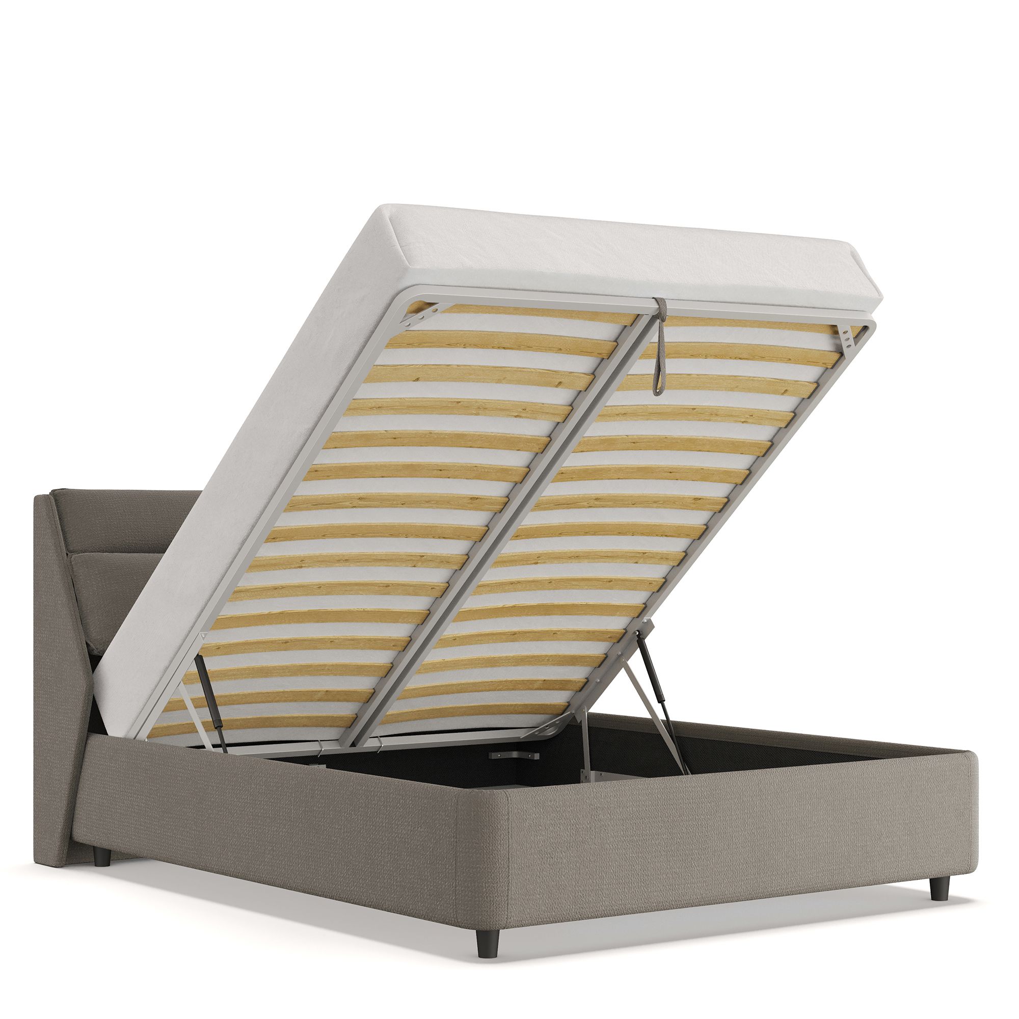Кровать TEWIN выполнена в полностью мягком текстильном корпусе из рогожки, а ее изголовье оснащено необычными подушками, расположенными под углом, чтобы на них было удобно облокотиться, отдыхая за чтением или просмотром сериала. Скругленные углы основания обеспечивают безопасность использования, а дизайн с высокими ножными опорами не создает препятствий при уборке с помощью робота-пылесоса. Модель оснащена надежным подъемным механизмом и вместительным ящиком для белья. Металлическое основание и ортопедическая решетка (каркас – металл) входят в комплектацию.