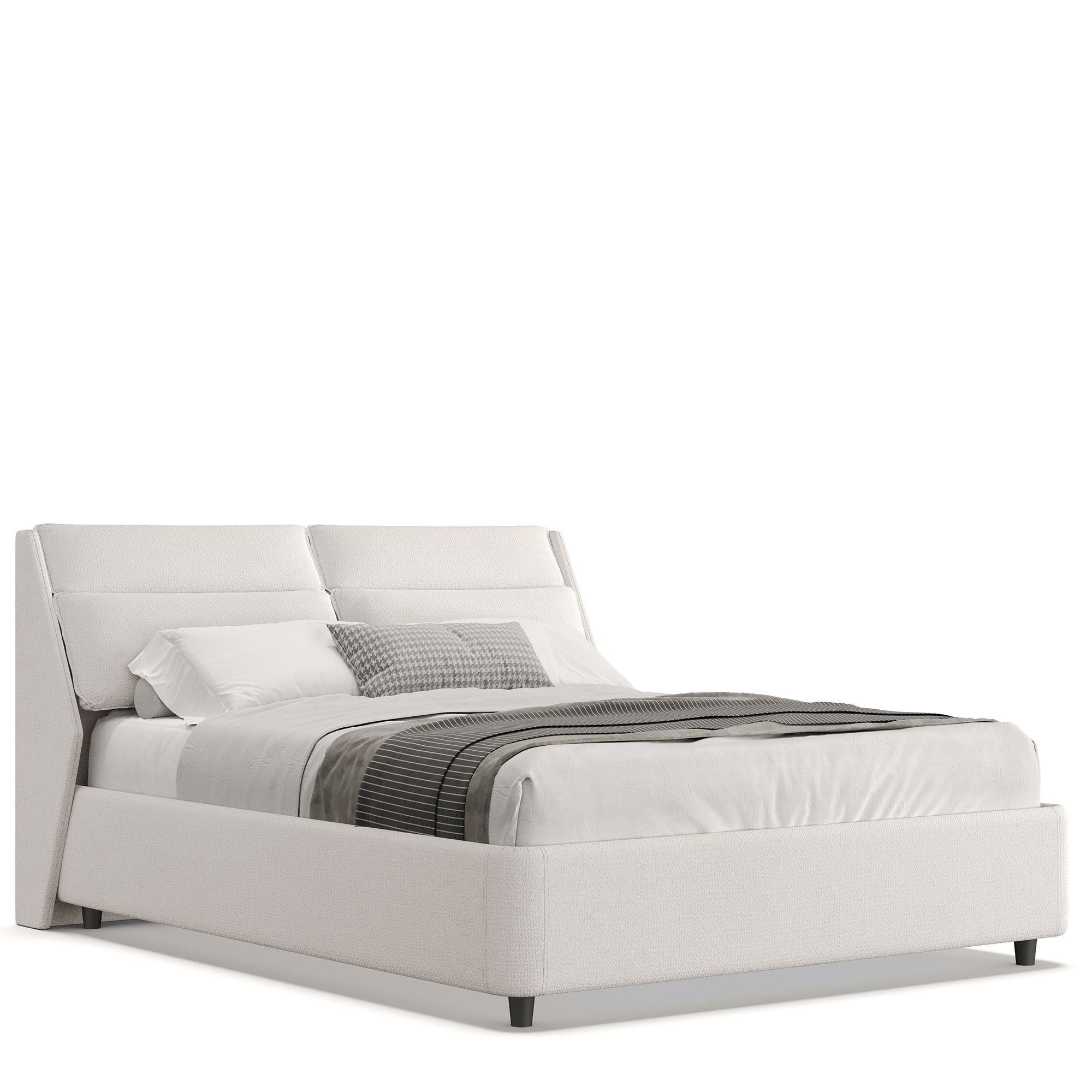 Кровать TEWIN выполнена в полностью мягком текстильном корпусе из рогожки, а ее изголовье оснащено необычными подушками, расположенными под углом, чтобы на них было удобно облокотиться, отдыхая за чтением или просмотром сериала. Скругленные углы основания обеспечивают безопасность использования, а дизайн с высокими ножными опорами не создает препятствий при уборке с помощью робота-пылесоса. Модель оснащена надежным подъемным механизмом и вместительным ящиком для белья. Металлическое основание и ортопедическая решетка (каркас – металл) входят в комплектацию.