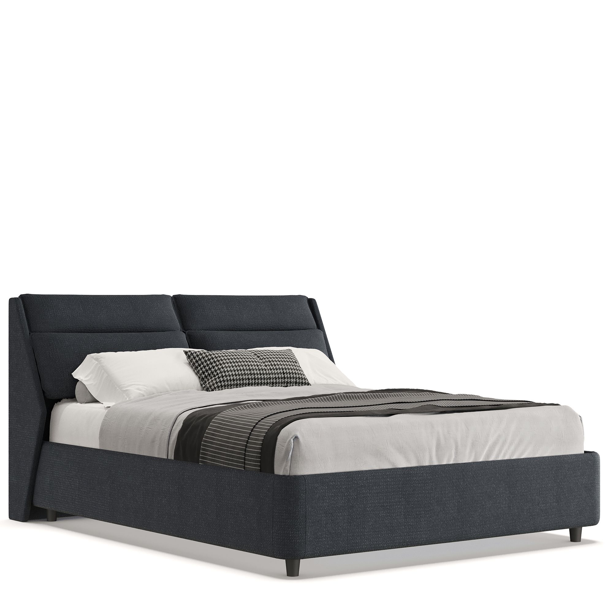 Кровать TEWIN выполнена в полностью мягком текстильном корпусе из рогожки, а ее изголовье оснащено необычными подушками, расположенными под углом, чтобы на них было удобно облокотиться, отдыхая за чтением или просмотром сериала. Скругленные углы основания обеспечивают безопасность использования, а дизайн с высокими ножными опорами не создает препятствий при уборке с помощью робота-пылесоса. Модель оснащена надежным подъемным механизмом и вместительным ящиком для белья. Металлическое основание и ортопедическая решетка (каркас – металл) входят в комплектацию.