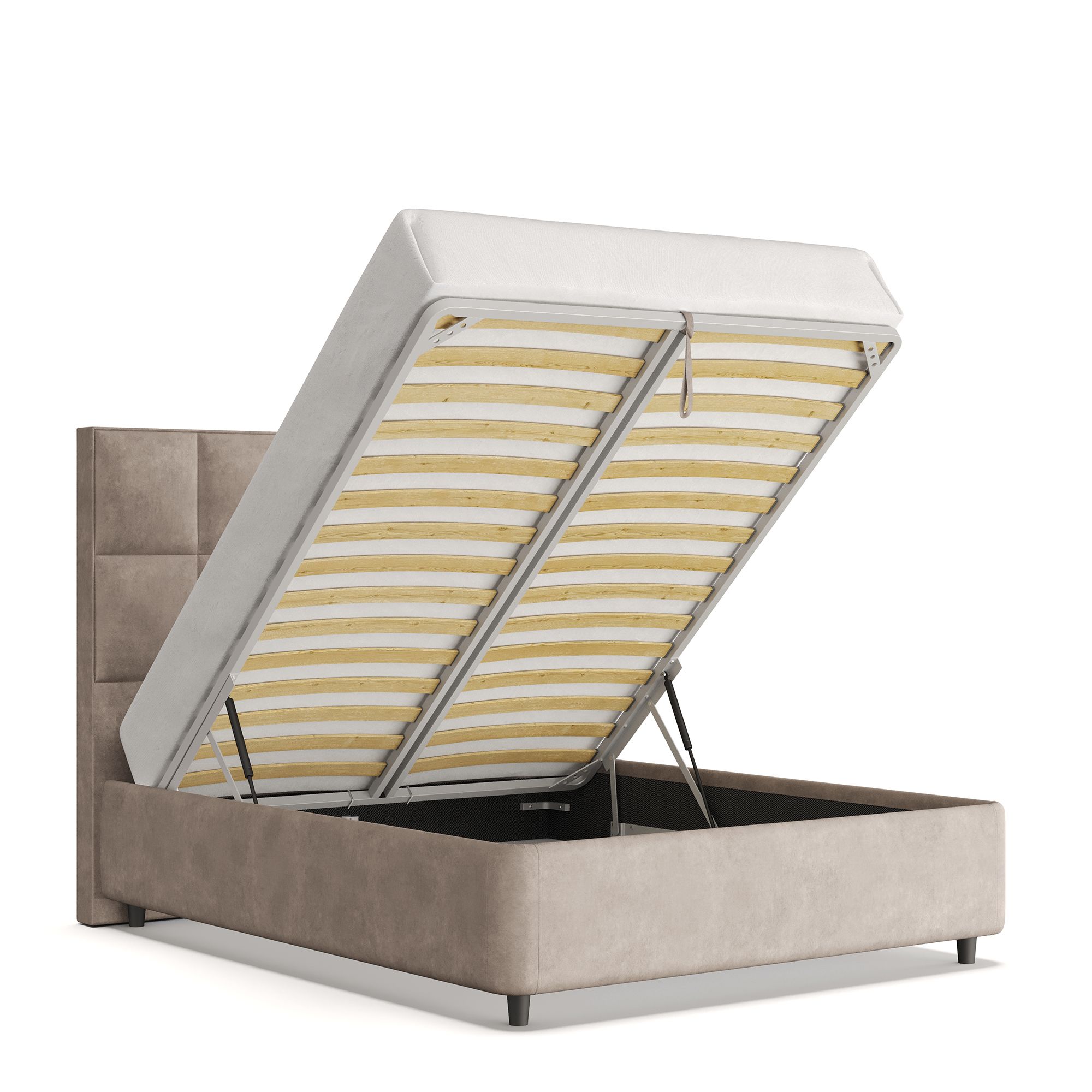 Механизм на газовых лифтах надежен и безопасен. Он плавно и бесшумно поднимает матрас, позволяя открывать ящик без особых усилий. Нагрузка на подъемный механизм – до 120 кг. Можно использовать матрас высотой до 32 см.