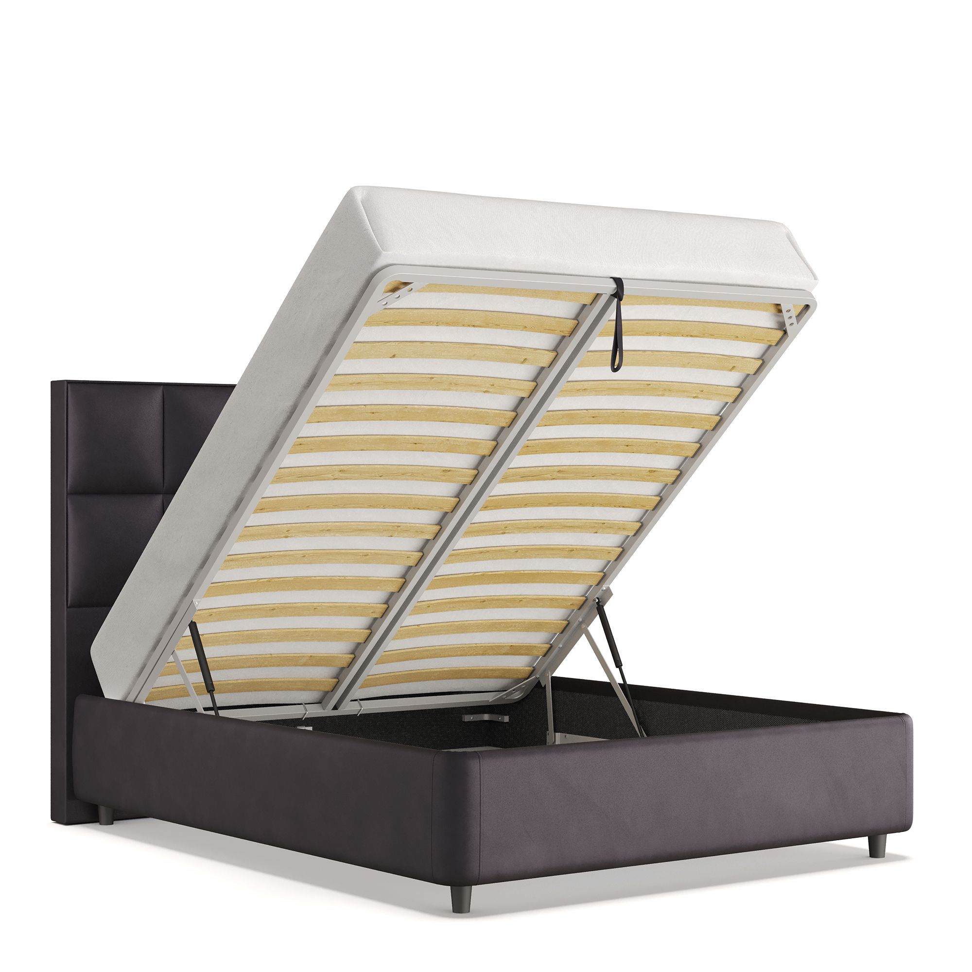Механизм на газовых лифтах надежен и безопасен. Он плавно и бесшумно поднимает матрас, позволяя открывать ящик без особых усилий. Нагрузка на подъемный механизм – до 120 кг. Можно использовать матрас высотой до 32 см.