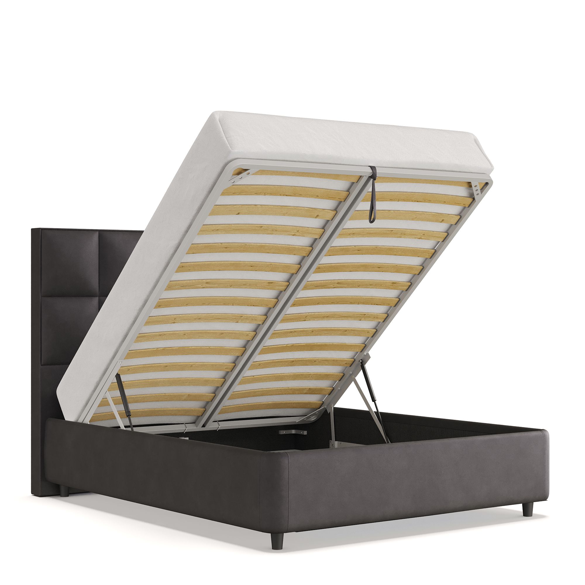 Механизм на газовых лифтах надежен и безопасен. Он плавно и бесшумно поднимает матрас, позволяя открывать ящик без особых усилий. Нагрузка на подъемный механизм – до 120 кг. Можно использовать матрас высотой до 32 см.
