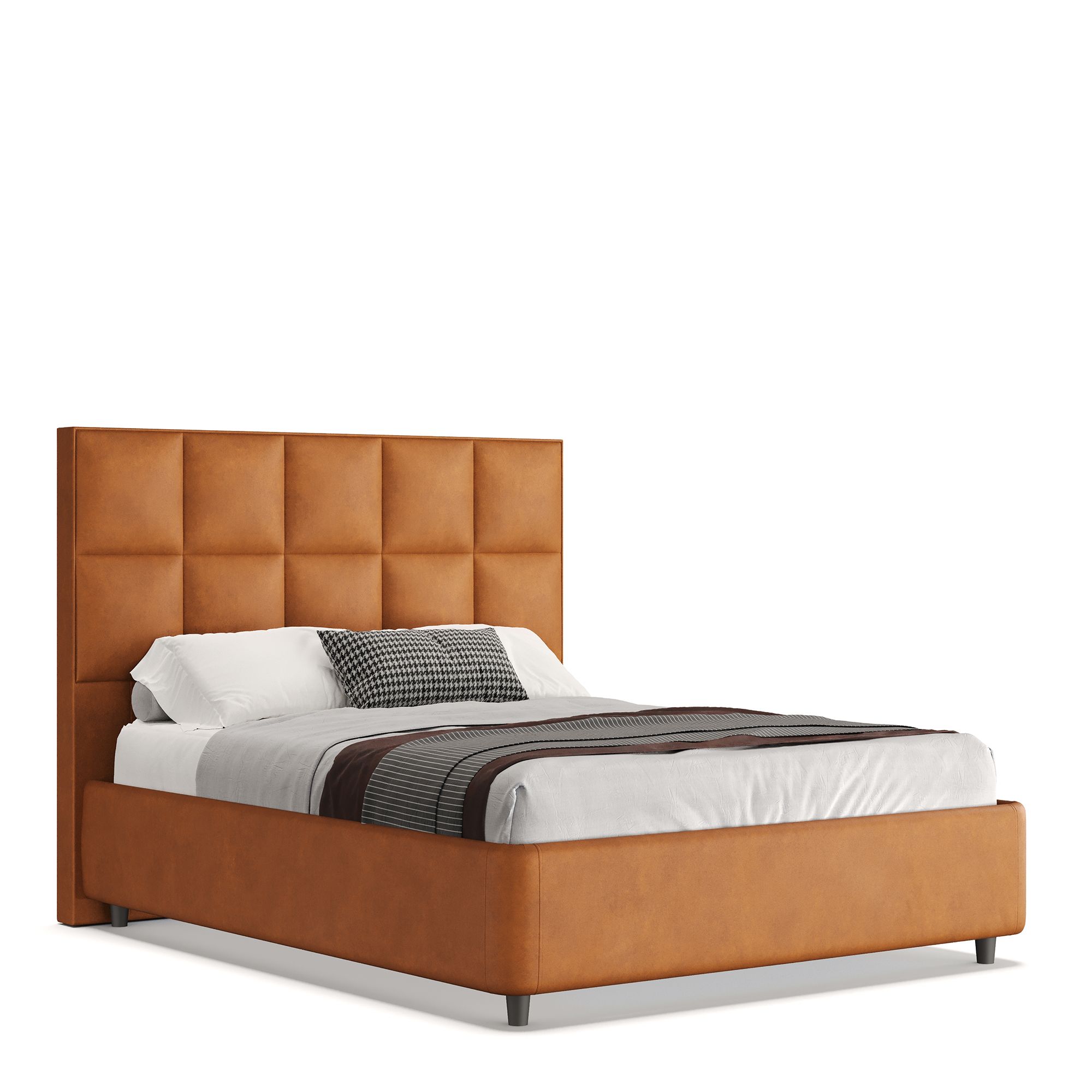 Полутораспальная кровать CORAL в полностью мягком текстильном корпусе отвечает запросам самых взыскательных покупателей, предъявляющих высокие требования к стилю и комфорту. Особое внимание привлекает изголовье модели, выполненное в отделке тактильно приятной тканью. Мягкое и уютное, оно обеспечивает дополнительную поддержку, создавая оптимальные условия для отдыха и сна. Геометрический узор в виде крупных квадратов делает кровать центральным элементом любой спальни, привнося в пространство четкий ритм. Модель оснащена надежным подъемным механизмом и вместительным ящиком для белья. Металлическое основание и ортопедическая решетка (каркас – металл) входят в комплектацию.