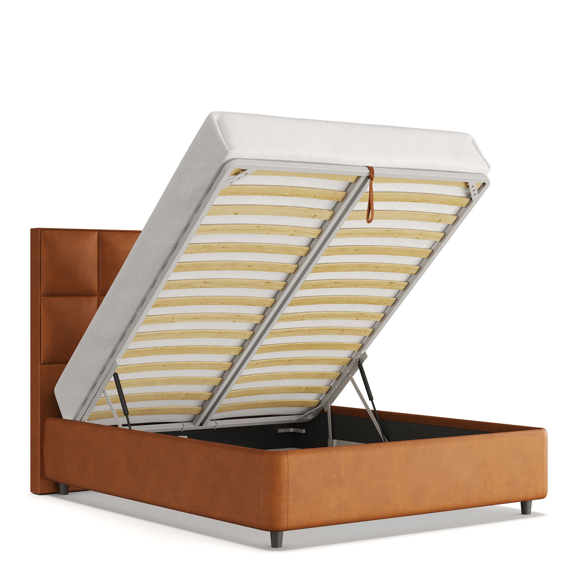 Механизм на газовых лифтах надежен и безопасен. Он плавно и бесшумно поднимает матрас, позволяя открывать ящик без особых усилий. Нагрузка на подъемный механизм – до 120 кг. Можно использовать матрас высотой до 32 см.