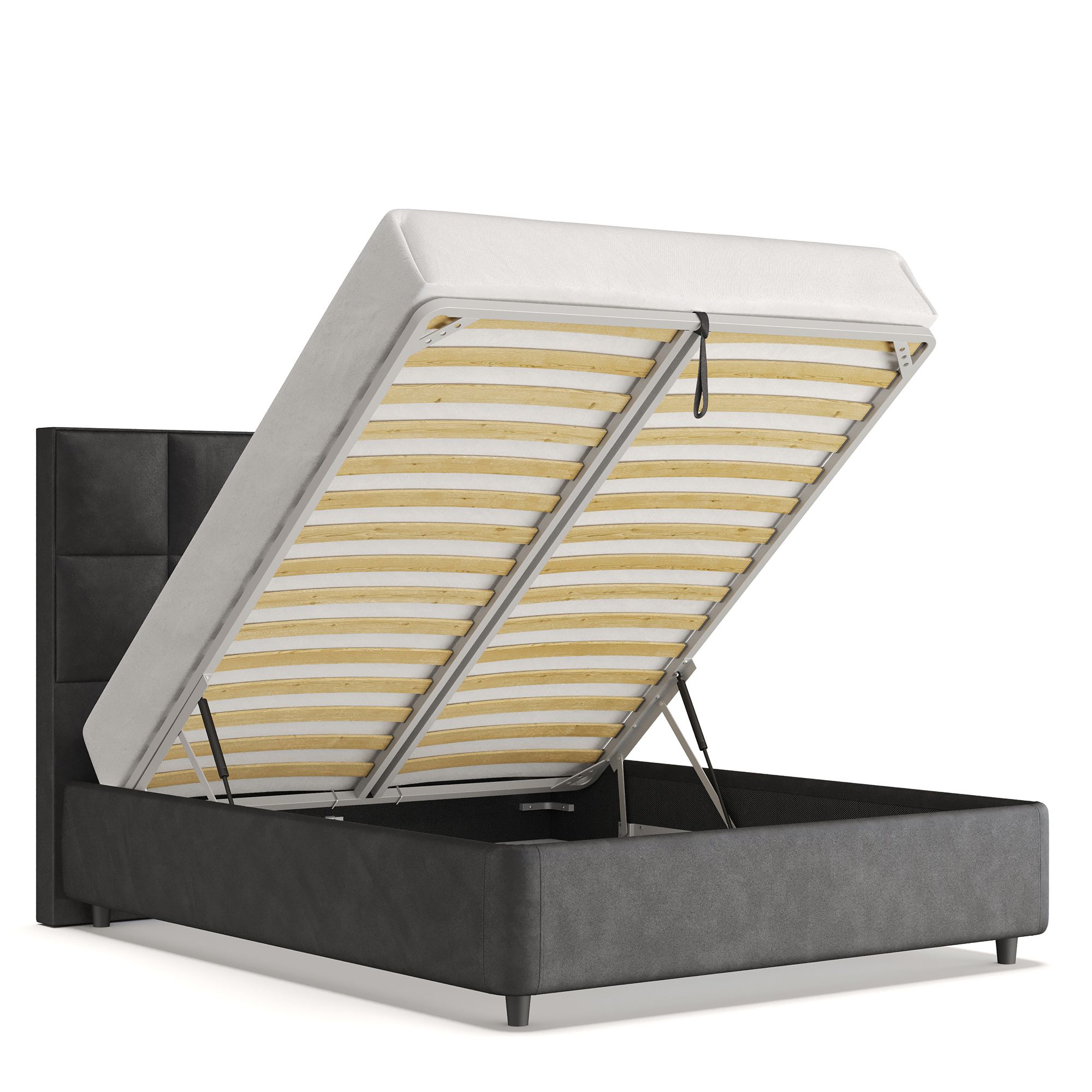 Механизм на газовых лифтах надежен и безопасен. Он плавно и бесшумно поднимает матрас, позволяя открывать ящик без особых усилий. Нагрузка на подъемный механизм – до 120 кг. Можно использовать матрас высотой до 32 см.