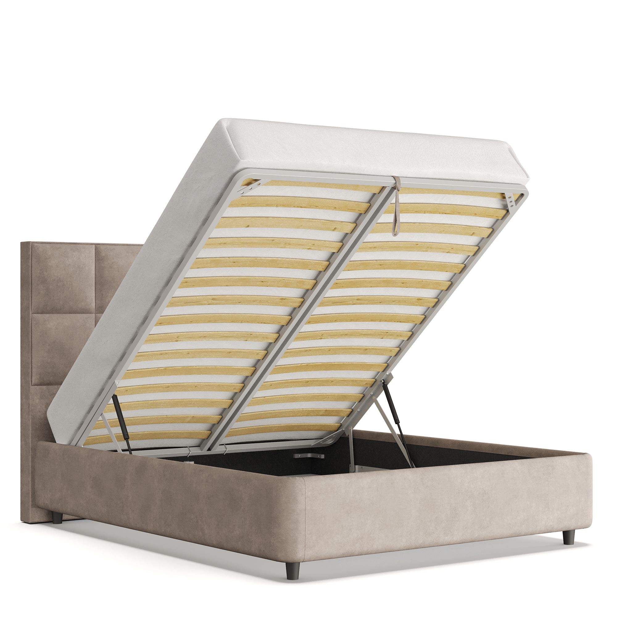 Механизм на газовых лифтах надежен и безопасен. Он плавно и бесшумно поднимает матрас, позволяя открывать ящик без особых усилий. Нагрузка на подъемный механизм – до 120 кг. Можно использовать матрас высотой до 32 см.