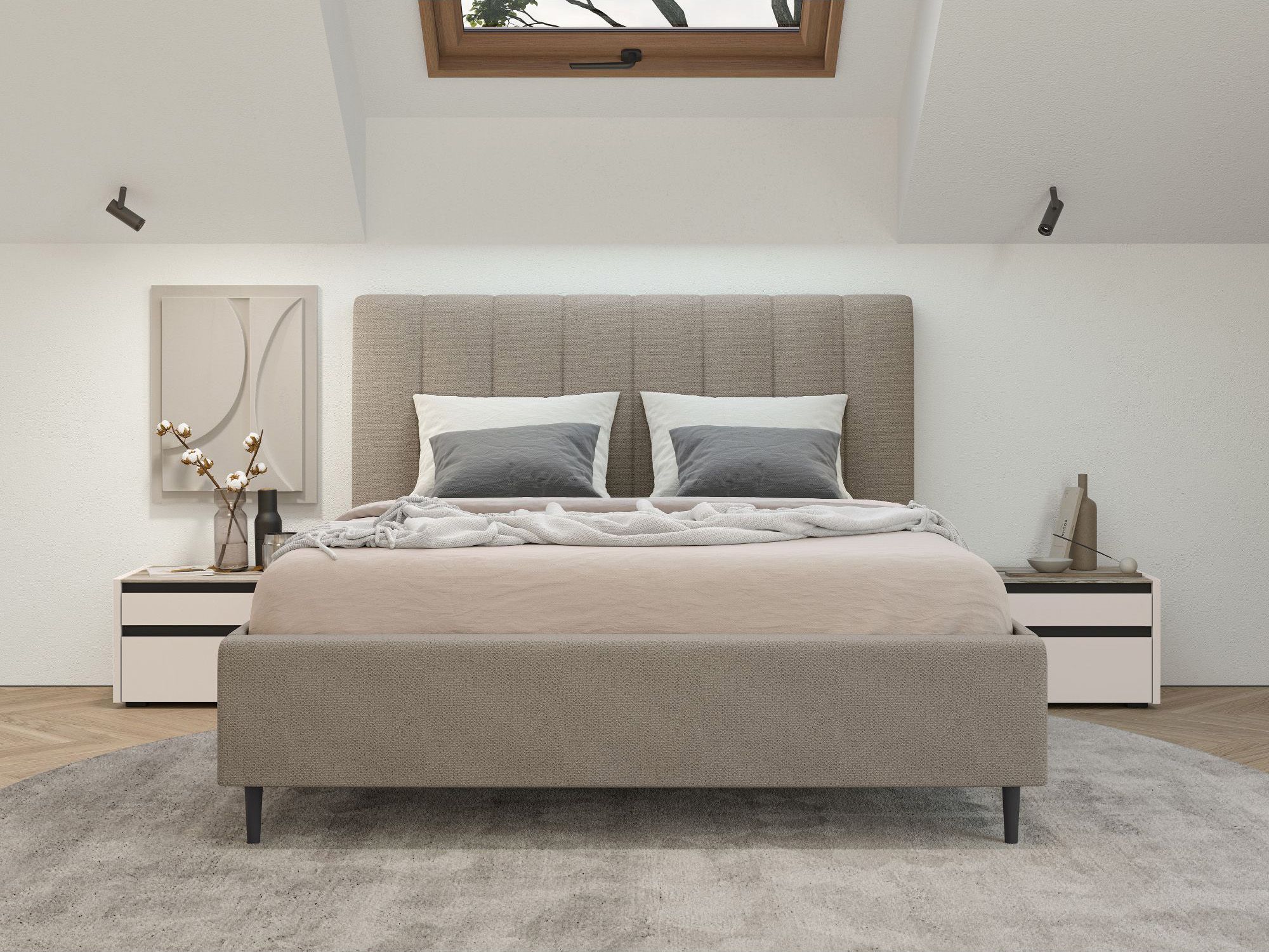 Оборотная сторона изголовья выполнена в обивочной ткани, что позволяет поставить кровать в центре комнаты и зонировать пространство.