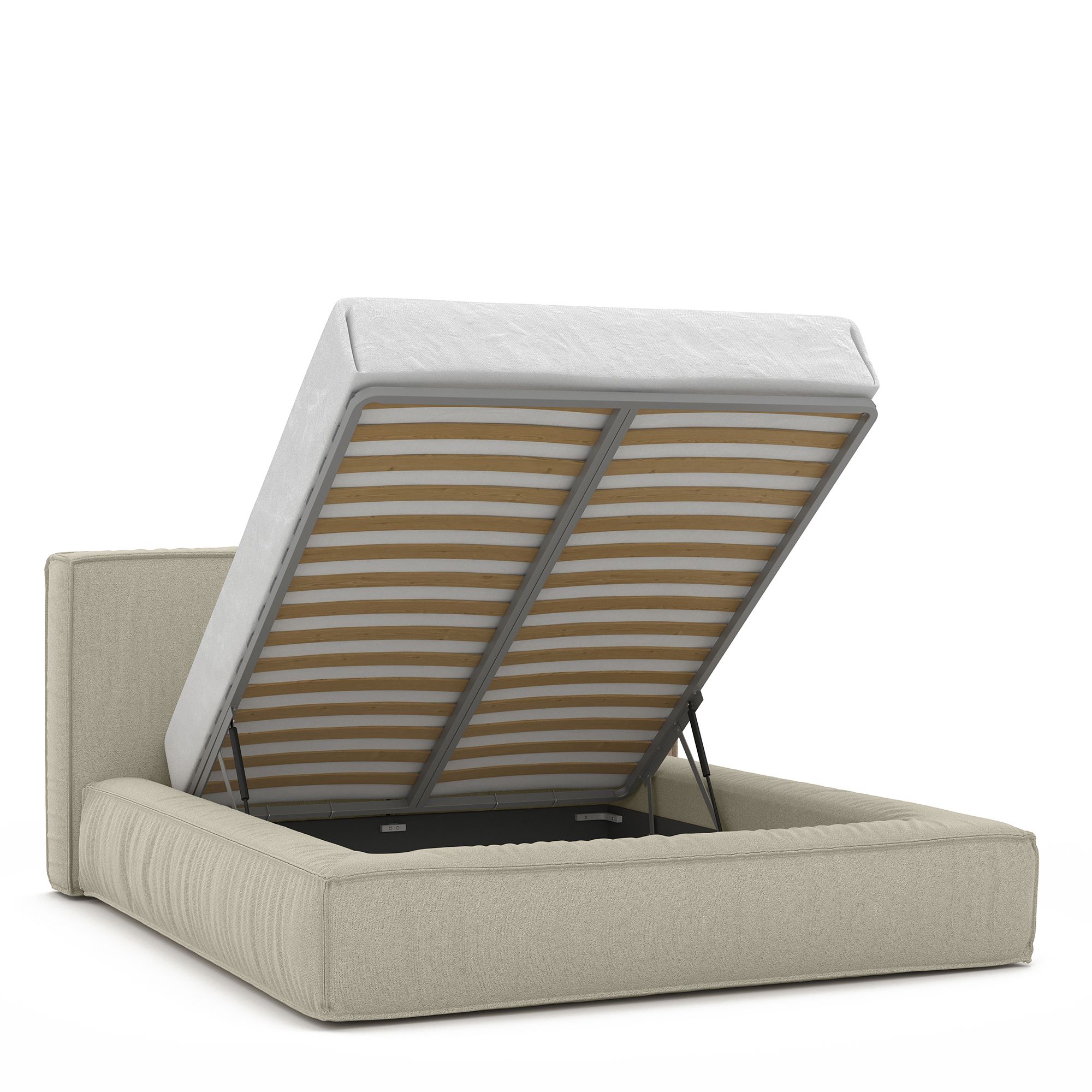Вместительный короб внутри кровати подойдет для хранения подушек, белья и других вещей. В бельевом ящике нет перегородок – это позволяет использовать его, в том числе, для хранения длинных и крупногабаритных вещей.