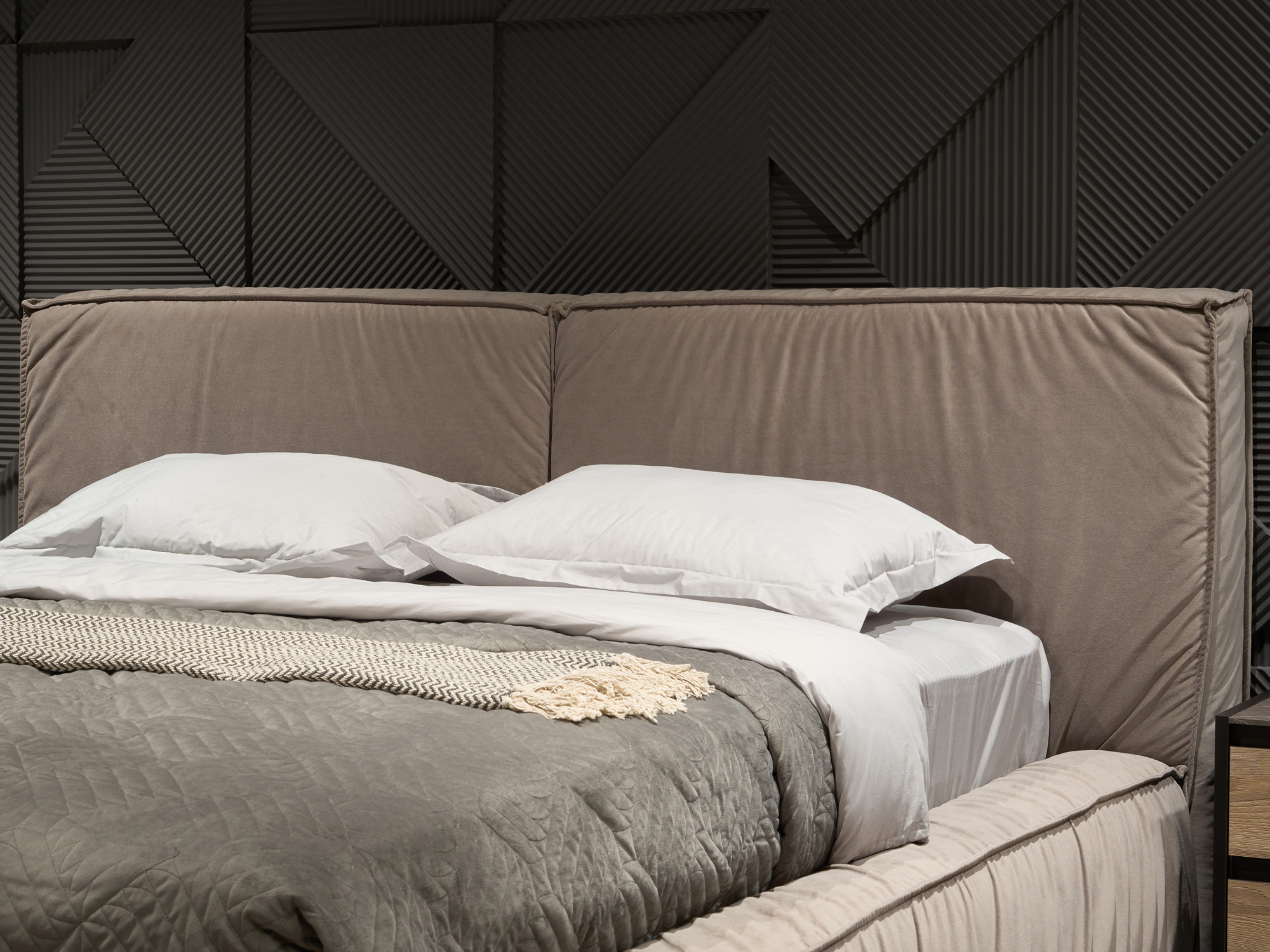 Благодаря мягкому наполнителю изголовья любители чтения перед сном и сериалов могут расположиться с комфортом. Выраженный декоративный кант обрамляет кровать, задавая ее очертание. Обивка кровати специально разработана по заказу бренда «Дятьково Design».