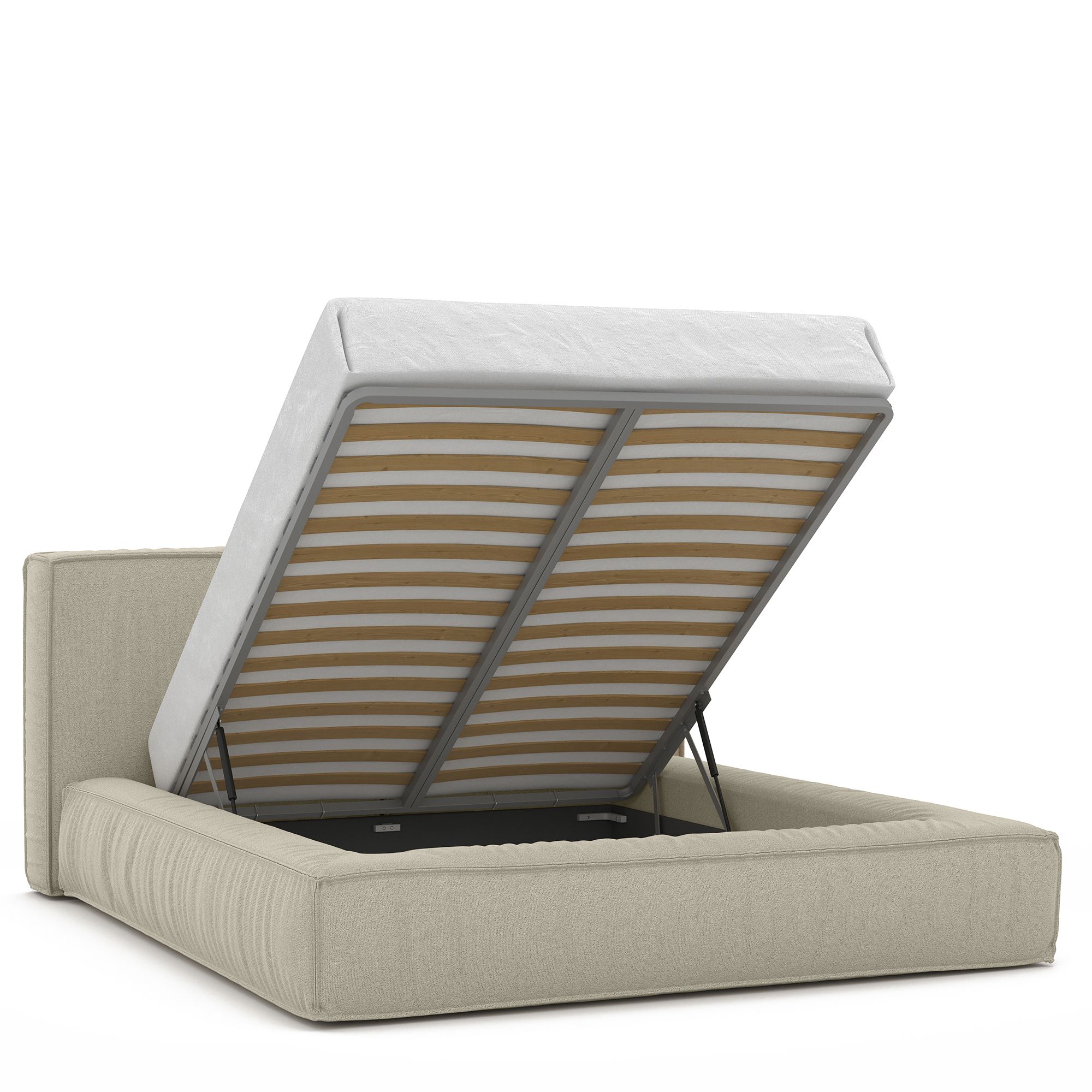 Вместительный короб внутри кровати подойдет для хранения подушек, белья и других вещей. В бельевом ящике нет перегородок – это позволяет использовать его, в том числе, для хранения длинных и крупногабаритных вещей.