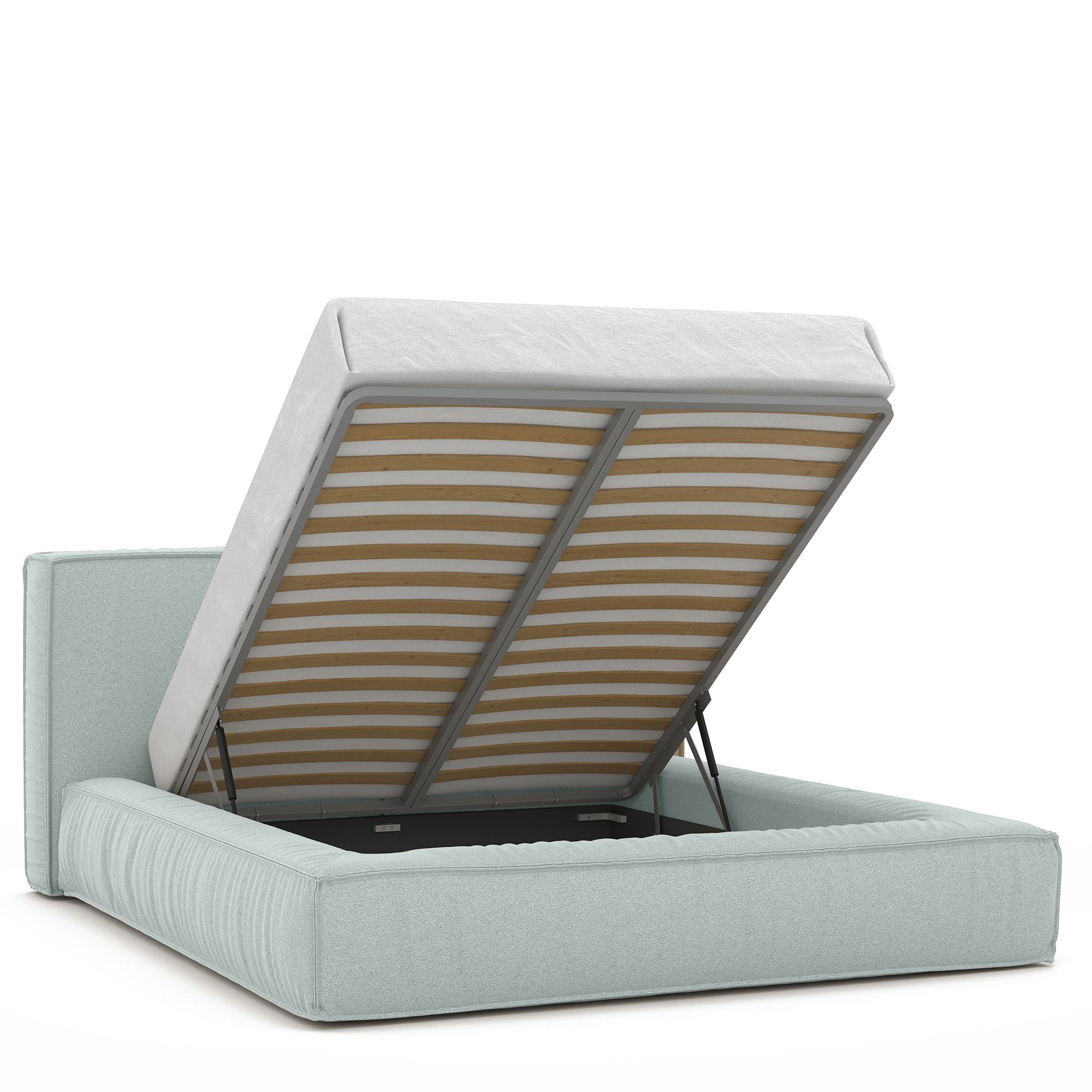 Вместительный короб внутри кровати подойдет для хранения подушек, белья и других вещей. В бельевом ящике нет перегородок – это позволяет использовать его, в том числе, для хранения длинных и крупногабаритных вещей.