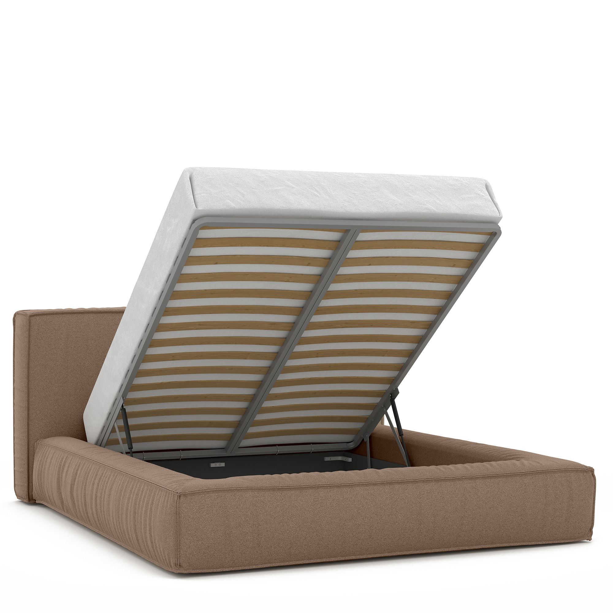 Механизм на газовых лифтах надежен и безопасен. Он плавно и бесшумно поднимает матрас, позволяя открывать ящик без особых усилий. Нагрузка на подъемный механизм – до 120 кг. Можно использовать матрас высотой до 45 см.