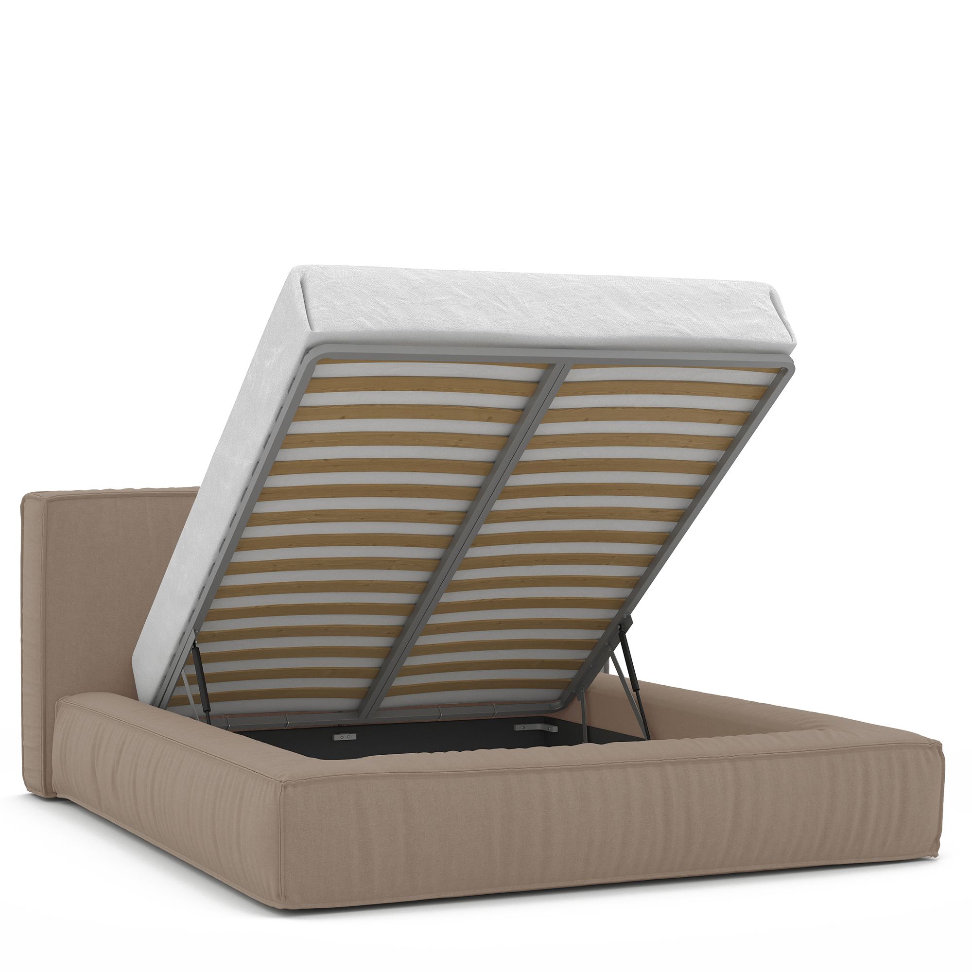 Механизм на газовых лифтах надежен и безопасен. Он плавно и бесшумно поднимает матрас, позволяя открывать ящик без особых усилий. Нагрузка на подъемный механизм – до 120 кг. Можно использовать матрас высотой до 45 см.