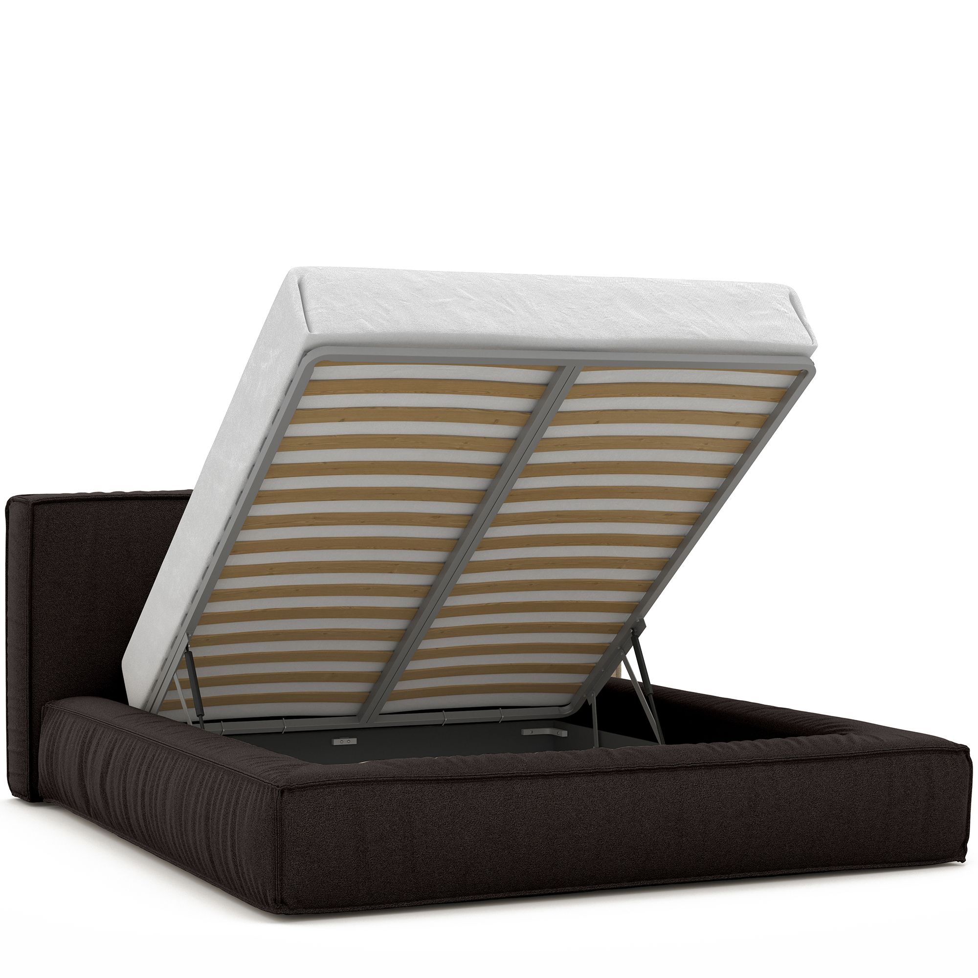 Вместительный короб внутри кровати подойдет для хранения подушек, белья и других вещей. В бельевом ящике нет перегородок – это позволяет использовать его, в том числе, для хранения длинных и крупногабаритных вещей.