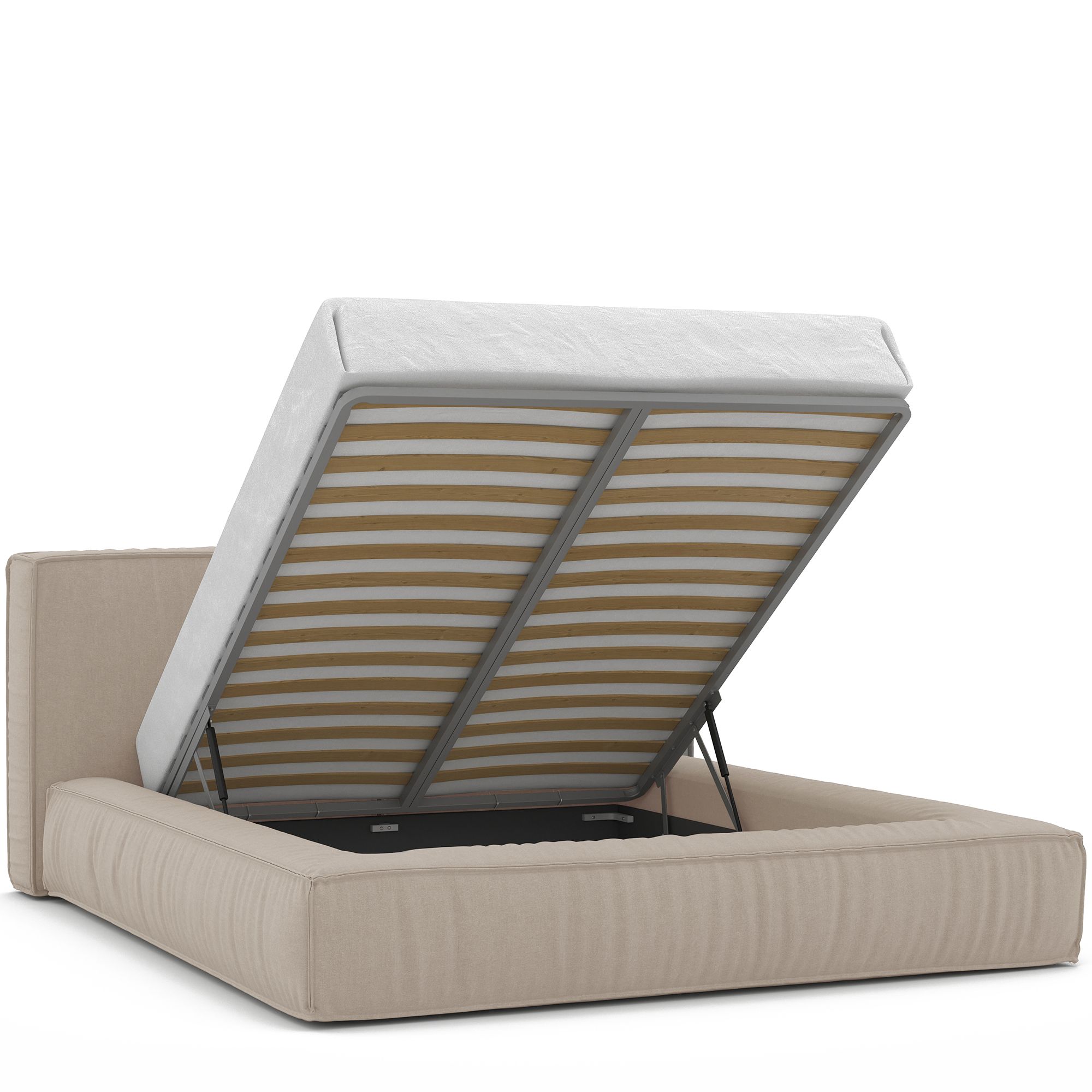 Вместительный короб внутри кровати подойдет для хранения подушек, белья и других вещей. В бельевом ящике нет перегородок – это позволяет использовать его, в том числе, для хранения длинных и крупногабаритных вещей.