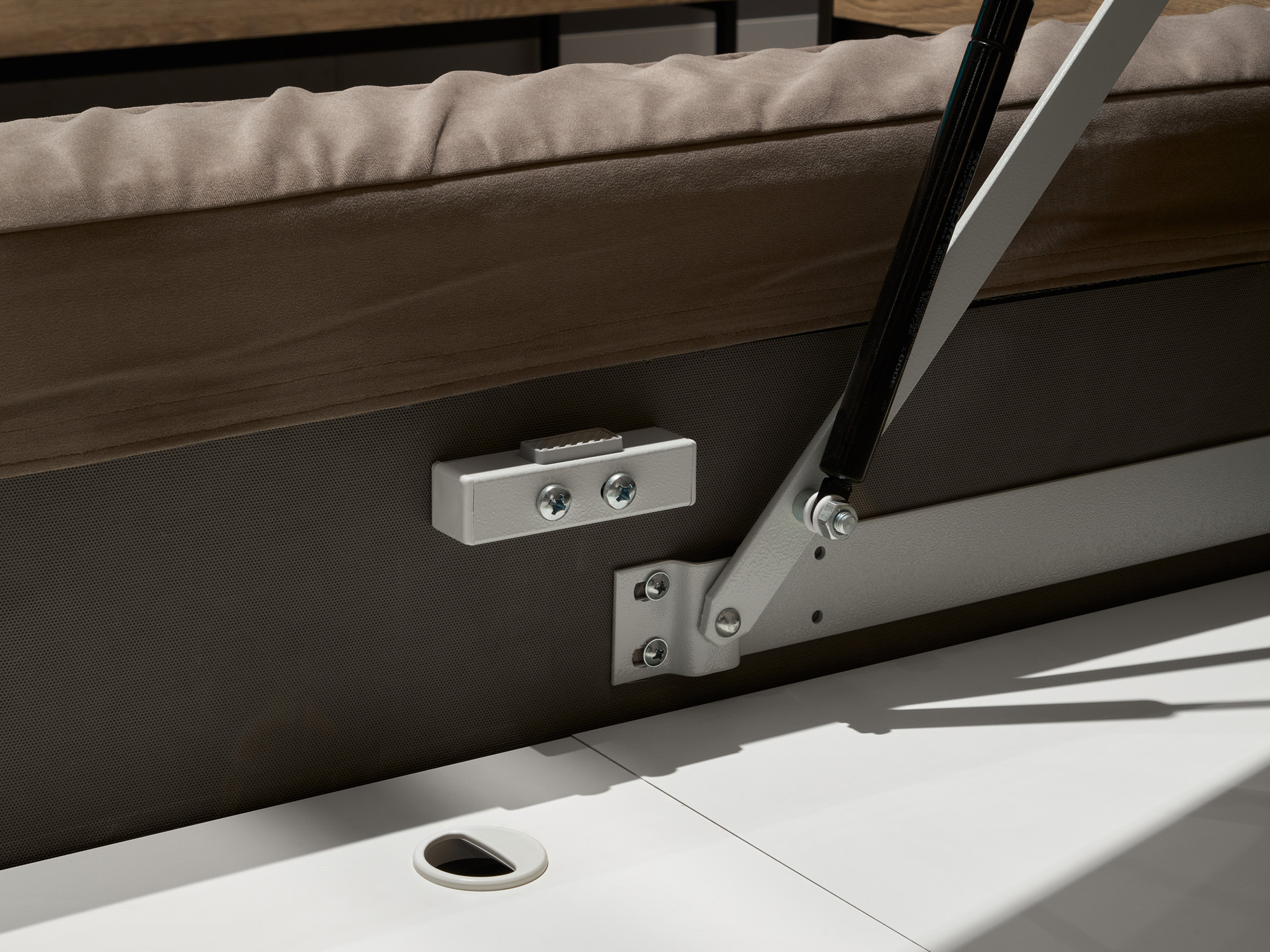 Механизм на газовых лифтах надежен и безопасен. Он плавно и бесшумно поднимает матрас, позволяя открывать ящик без особых усилий. Нагрузка на подъемный механизм – до 120 кг. Можно использовать матрас высотой до 45 см.