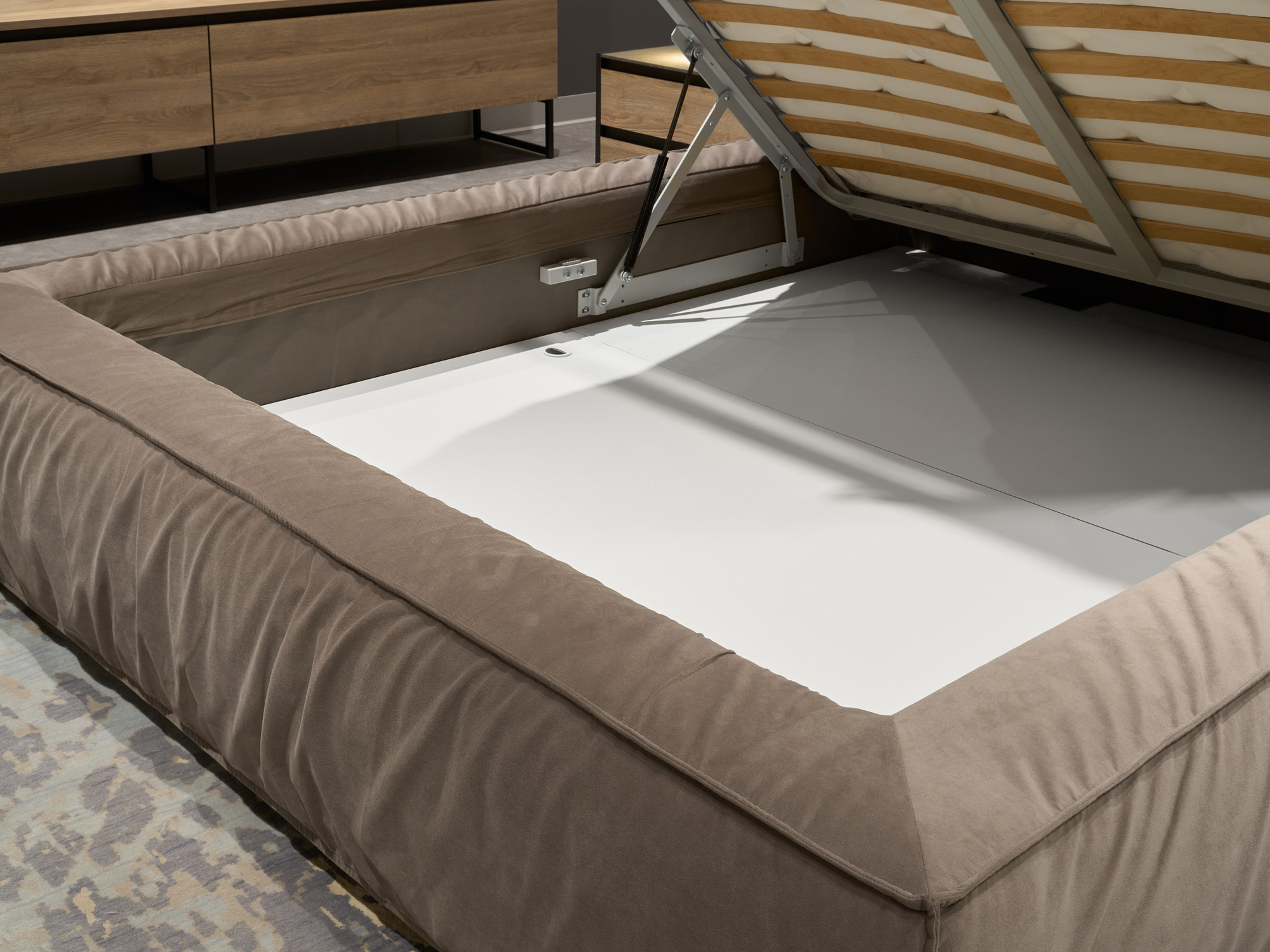 Вместительный короб внутри кровати подойдет для хранения подушек, белья и других вещей. В бельевом ящике нет перегородок – это позволяет использовать его, в том числе, для хранения длинных и крупногабаритных вещей.