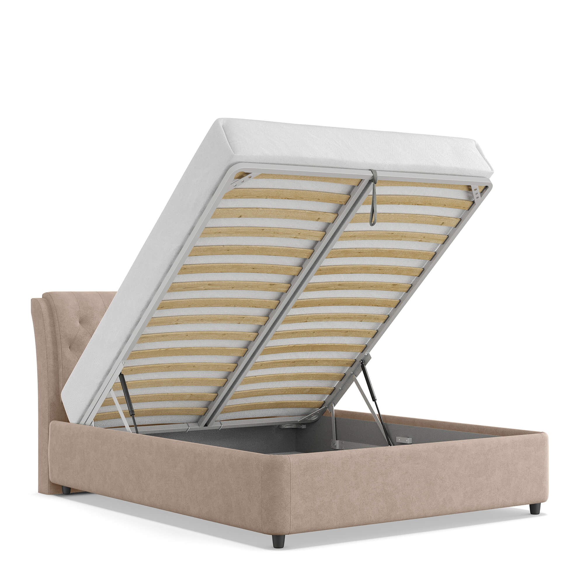 Механизм на газовых лифтах надёжен, безопасен и рассчитан на 25 лет службы. Он плавно и бесшумно поднимает матрас, позволяя открывать ящик без особых усилий.