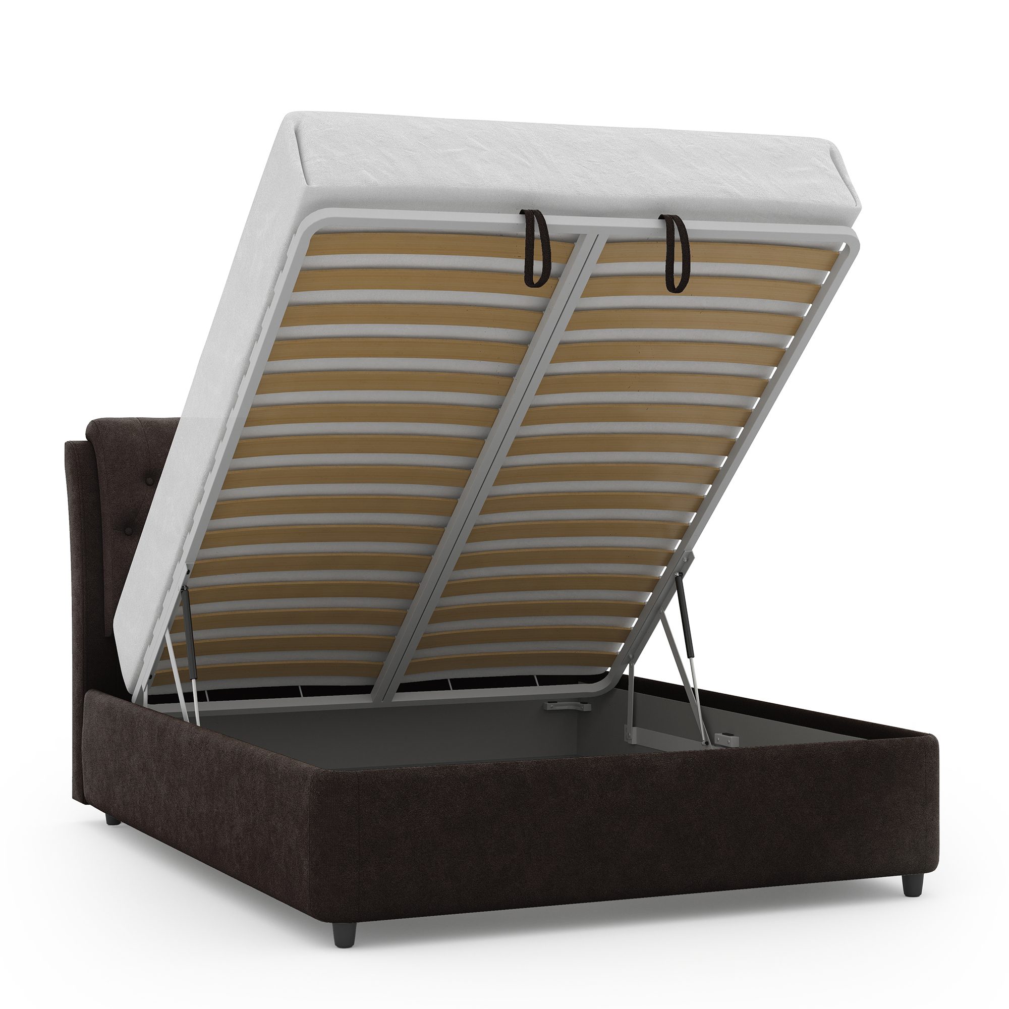 Механизм на газовых лифтах надёжен, безопасен и рассчитан на 25 лет службы. Он плавно и бесшумно поднимает матрас, позволяя открывать ящик без особых усилий.
