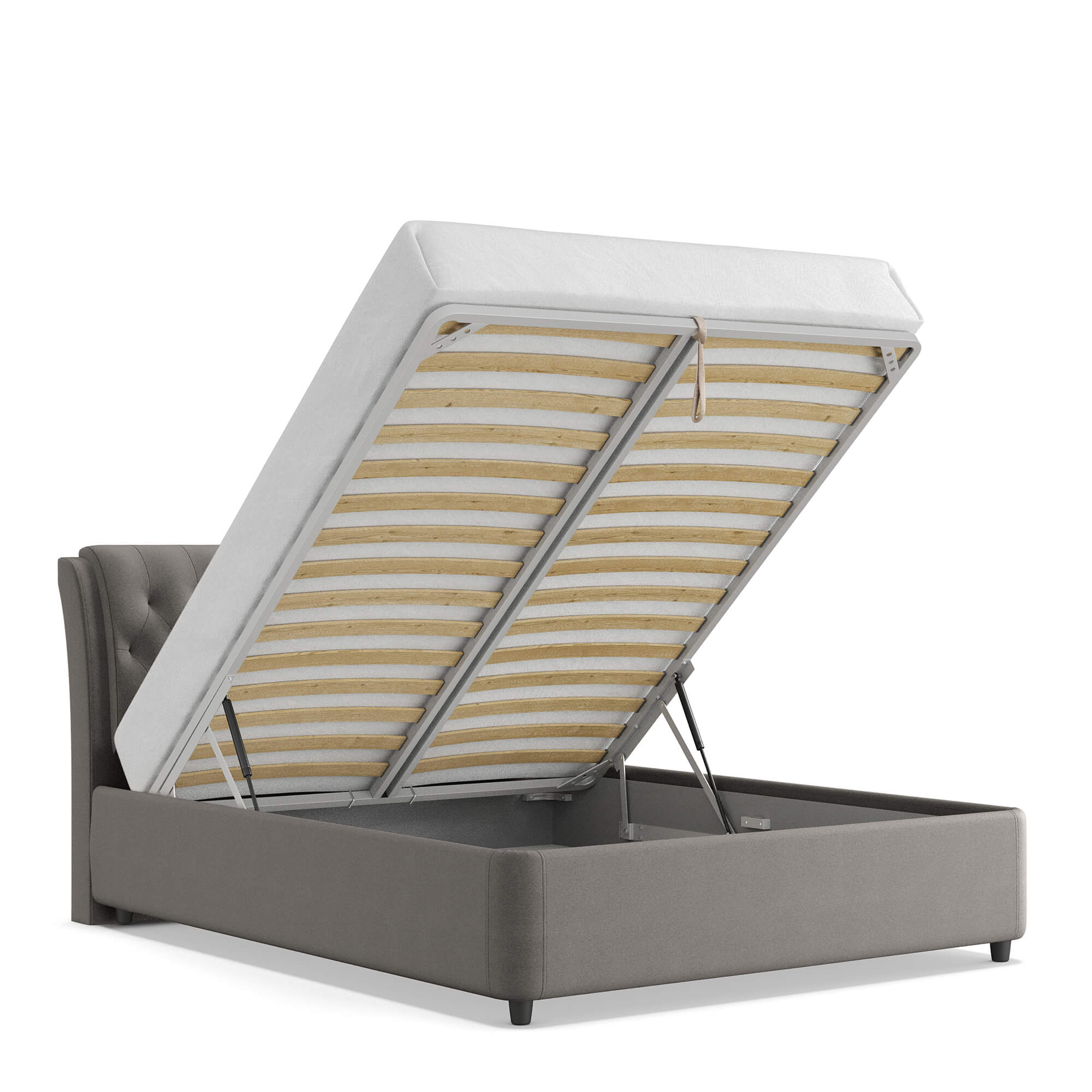 Механизм на газовых лифтах надёжен, безопасен и рассчитан на 25 лет службы. Он плавно и бесшумно поднимает матрас, позволяя открывать ящик без особых усилий.
