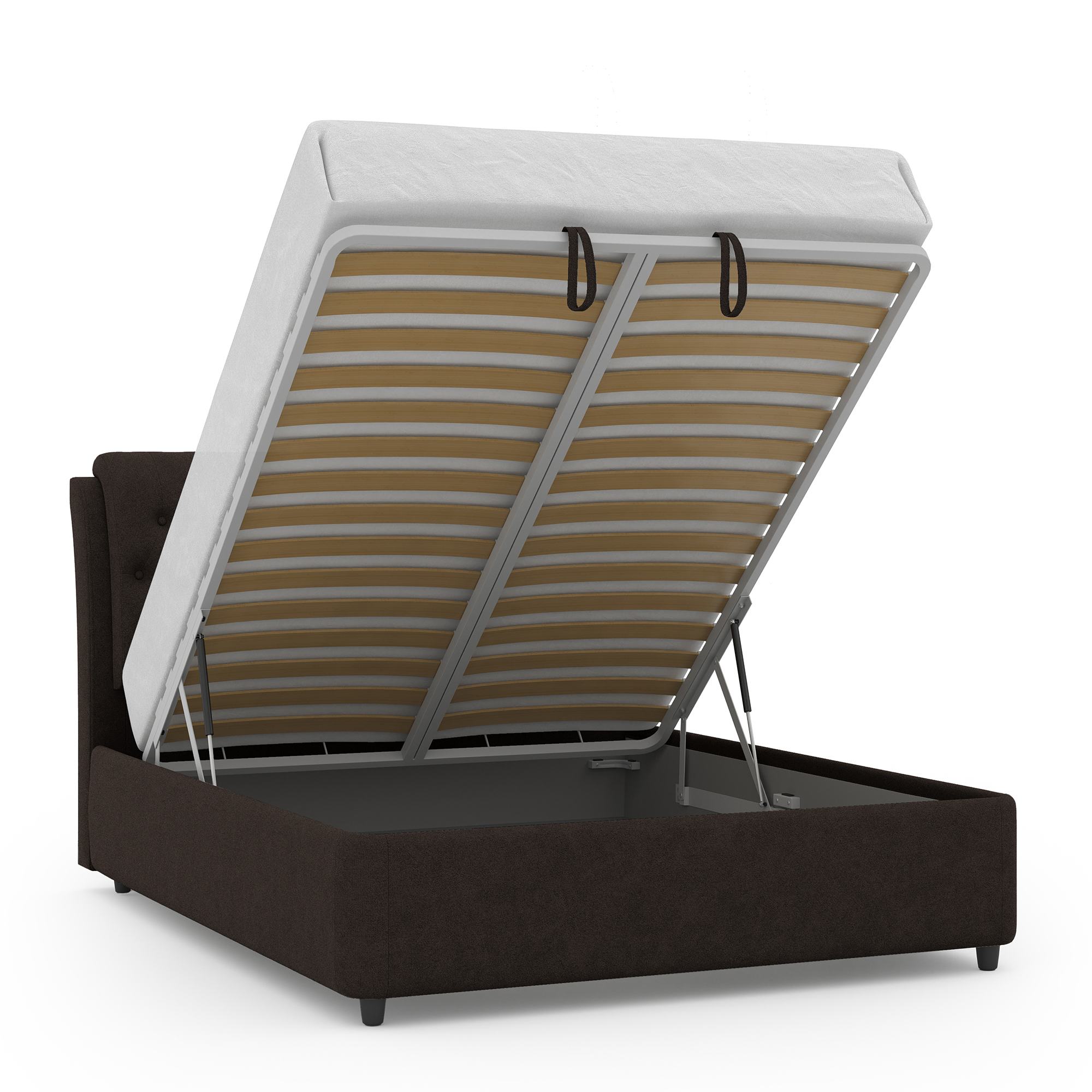 Механизм на газовых лифтах надёжен, безопасен и рассчитан на 25 лет службы. Он плавно и бесшумно поднимает матрас, позволяя открывать ящик без особых усилий.