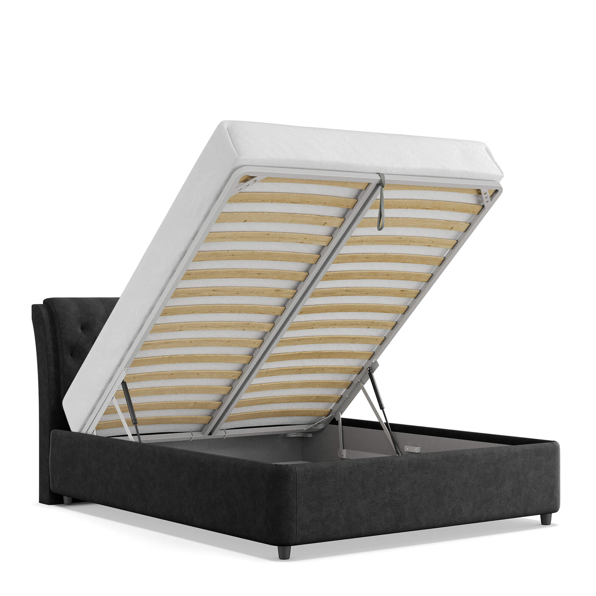Механизм на газовых лифтах надёжен, безопасен и рассчитан на 25 лет службы. Он плавно и бесшумно поднимает матрас, позволяя открывать ящик без особых усилий.