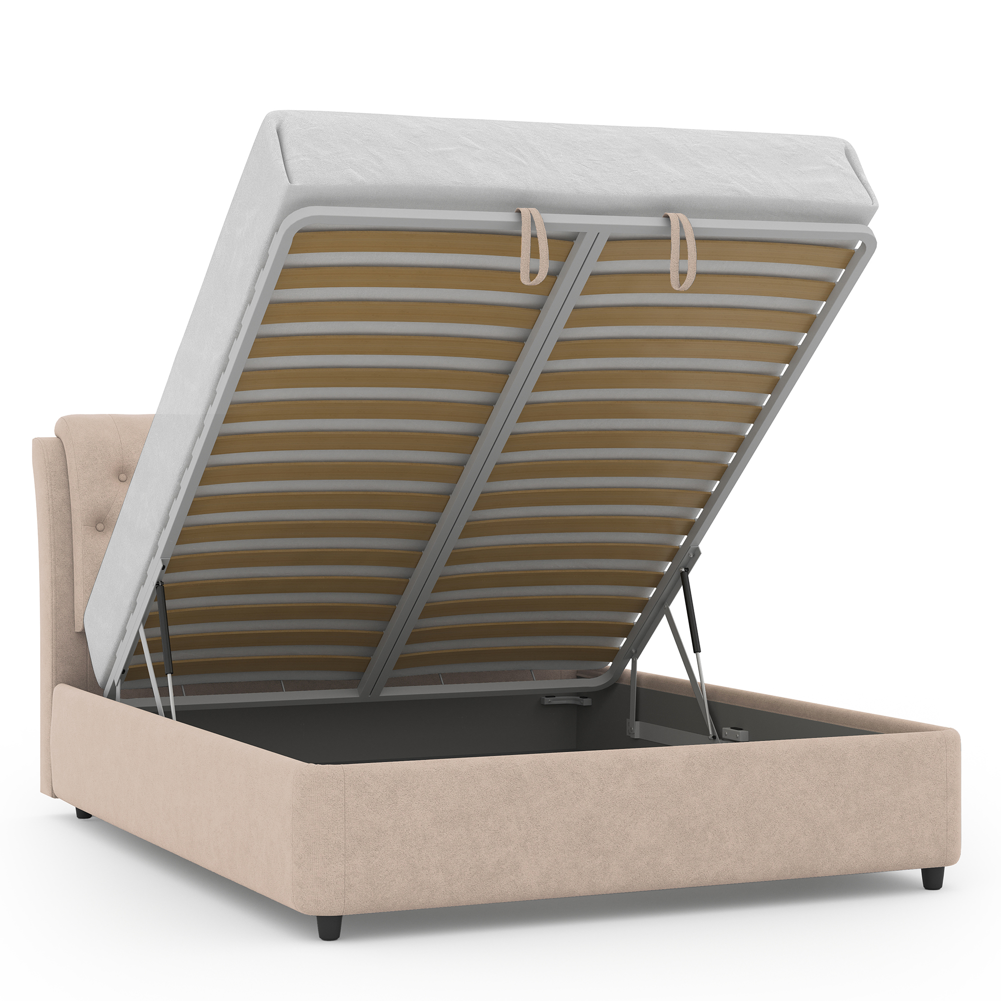 Механизм на газовых лифтах надёжен, безопасен и рассчитан на 25 лет службы. Он плавно и бесшумно поднимает матрас, позволяя открывать ящик без особых усилий.