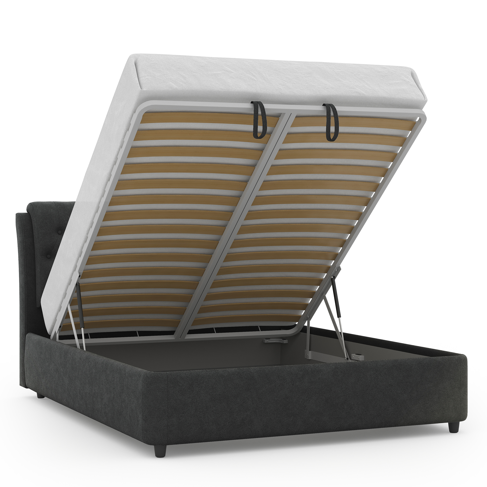 Механизм на газовых лифтах надёжен, безопасен и рассчитан на 25 лет службы. Он плавно и бесшумно поднимает матрас, позволяя открывать ящик без особых усилий.