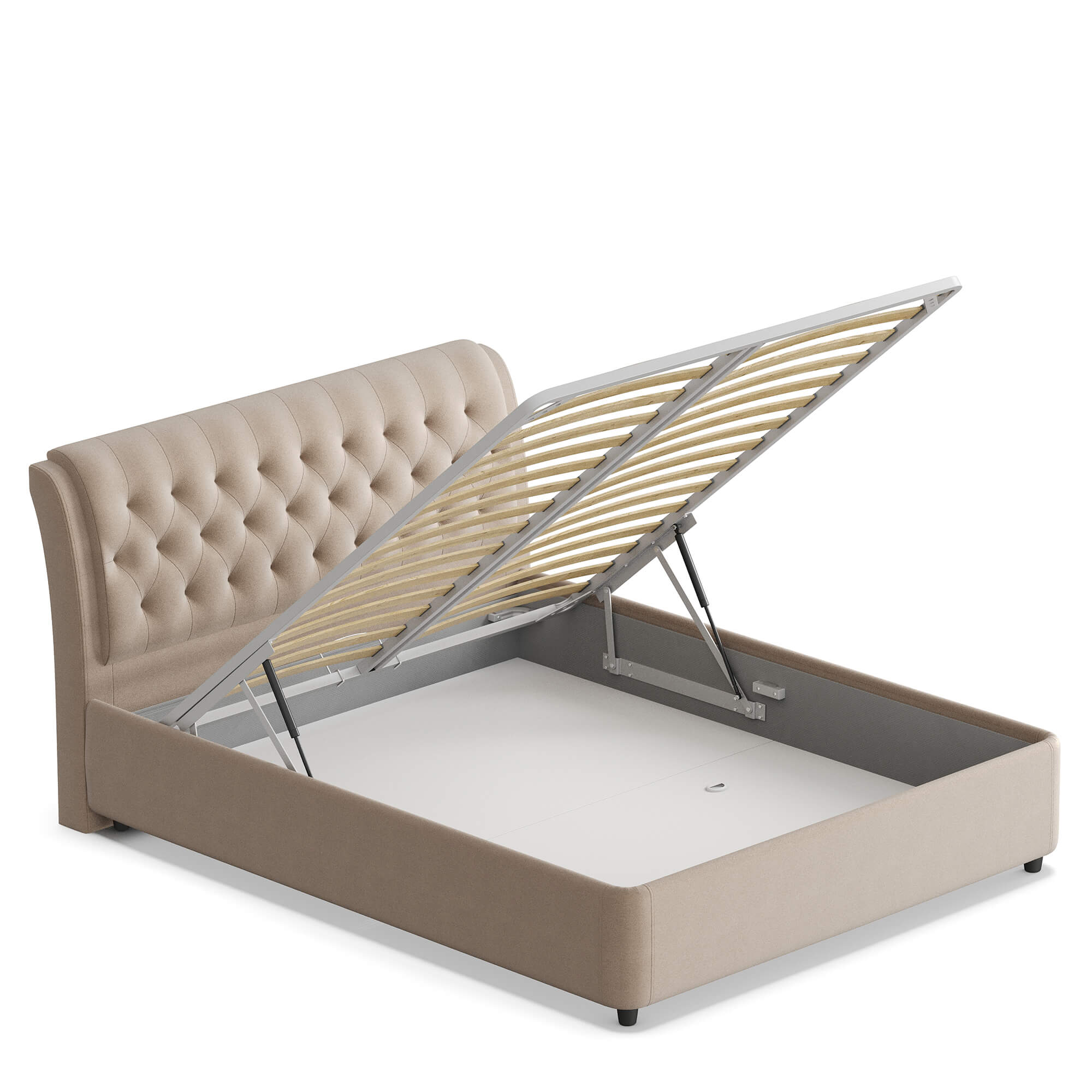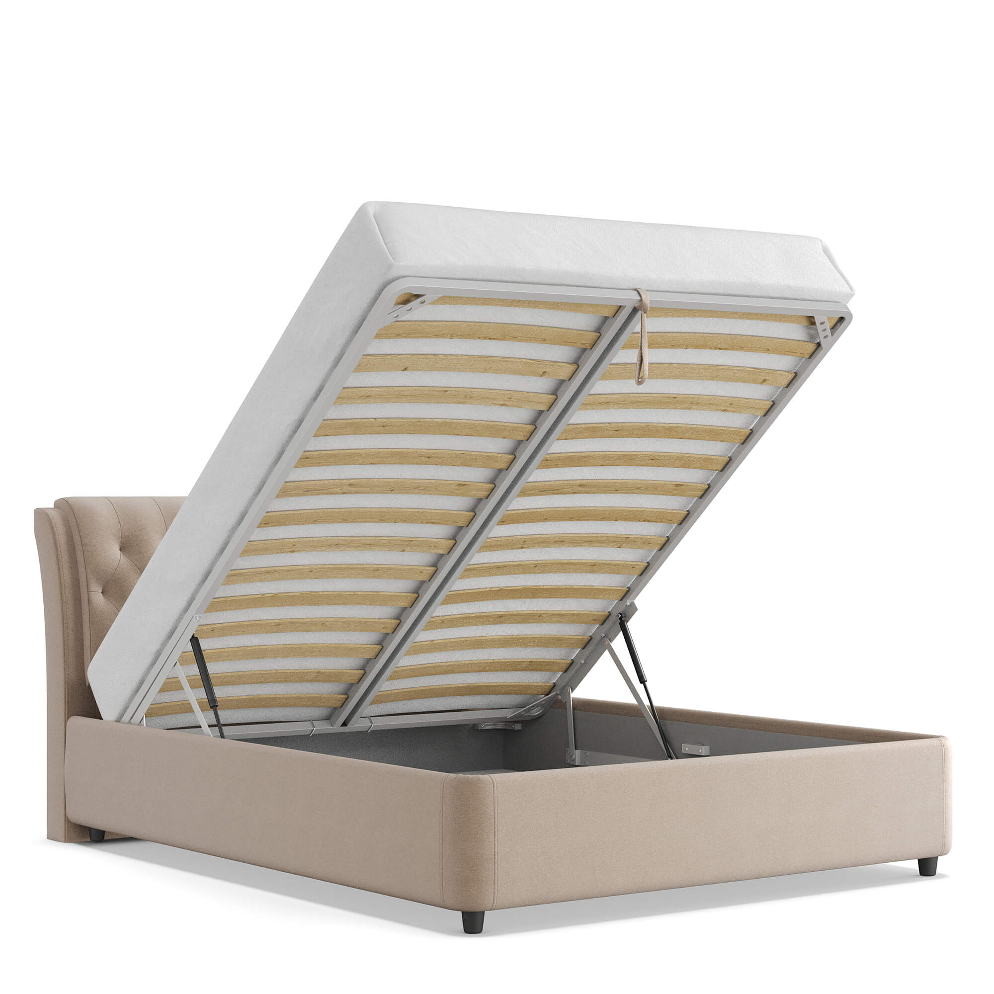Механизм на газовых лифтах надёжен, безопасен и рассчитан на 25 лет службы. Он плавно и бесшумно поднимает матрас, позволяя открывать ящик без особых усилий.
