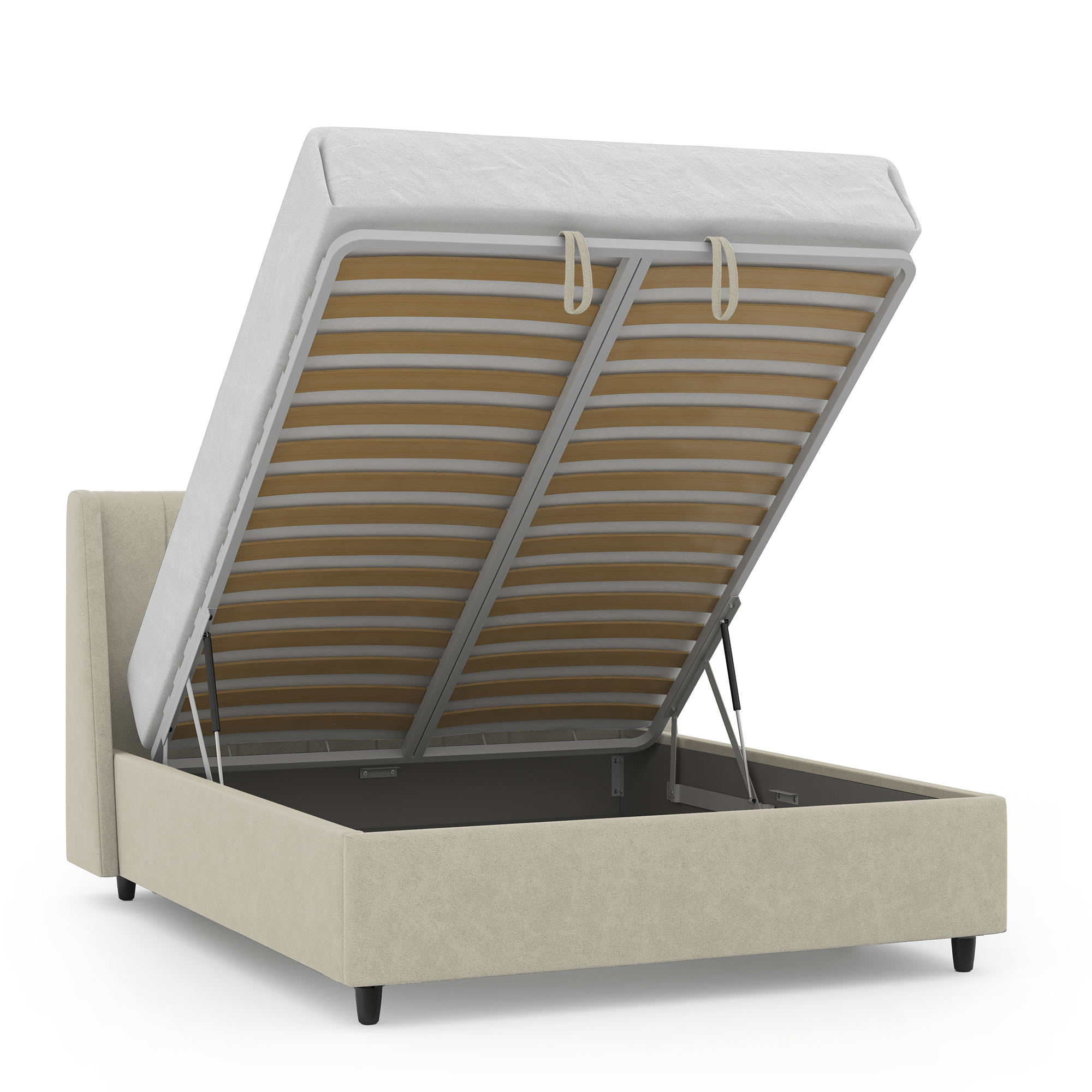 Механизм на газовых лифтах надёжен и безопасен. Он плавно и бесшумно поднимает матрас, позволяя открывать ящик без особых усилий.