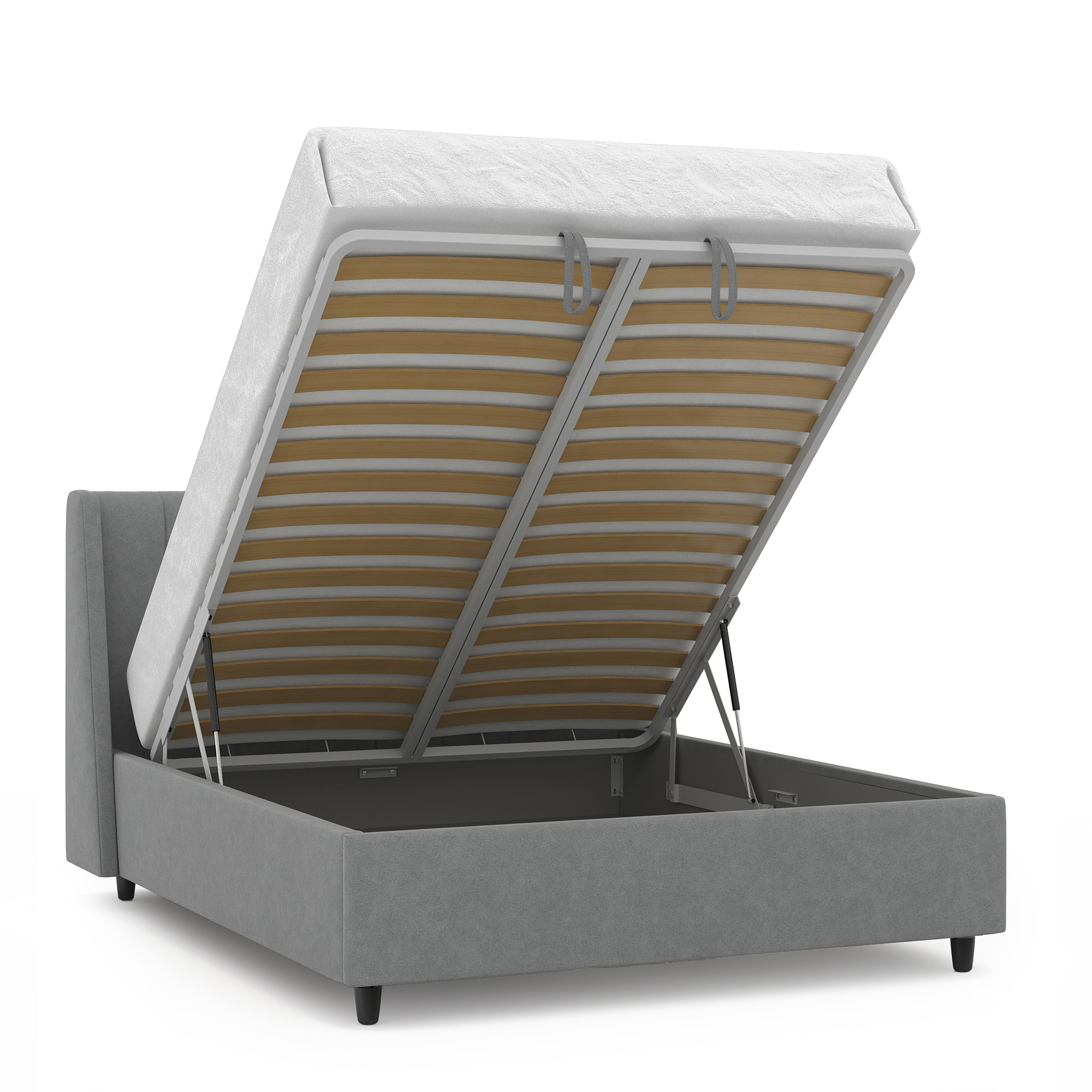 Механизм на газовых лифтах надёжен и безопасен. Он плавно и бесшумно поднимает матрас, позволяя открывать ящик без особых усилий.