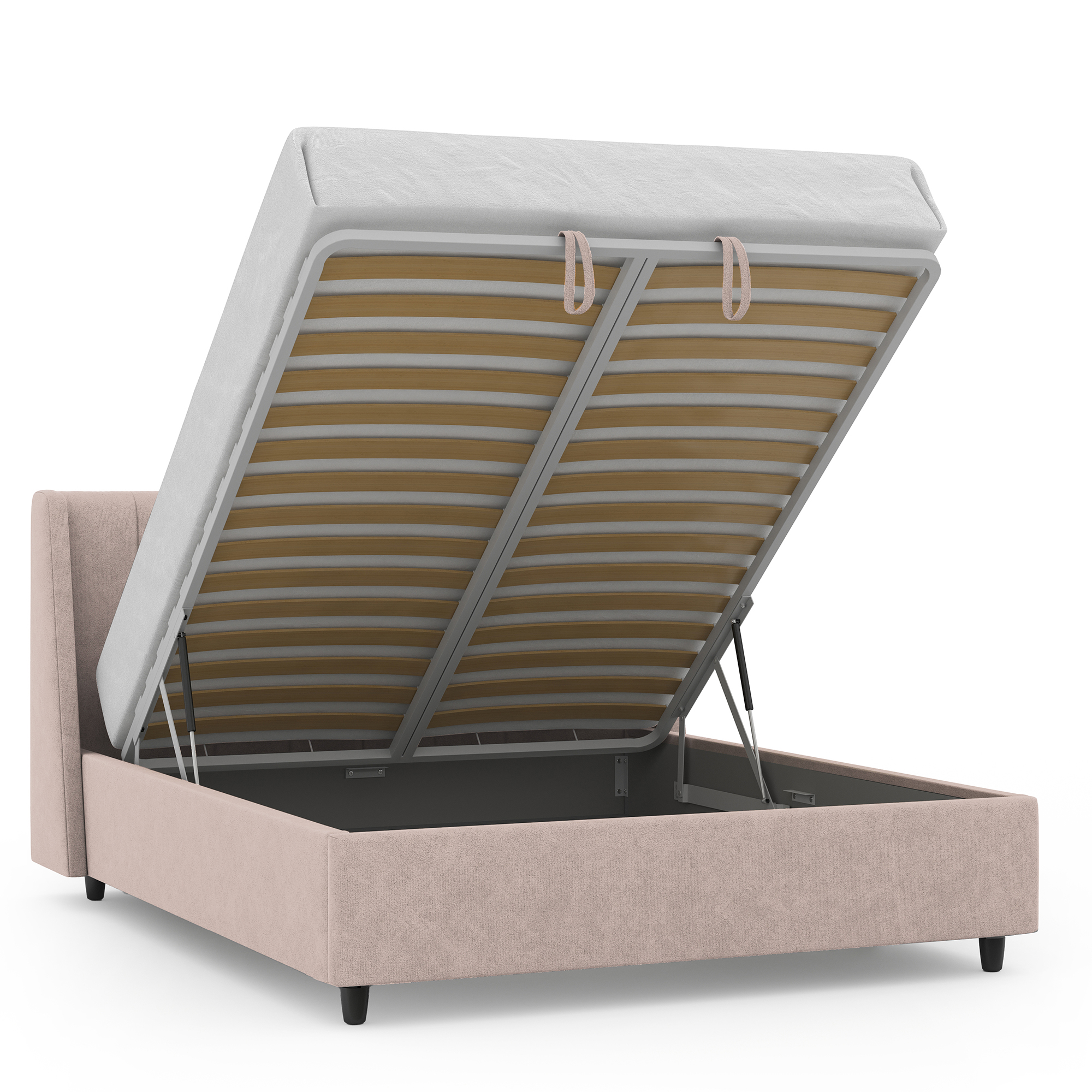 Механизм на газовых лифтах надёжен и безопасен. Он плавно и бесшумно поднимает матрас, позволяя открывать ящик без особых усилий.