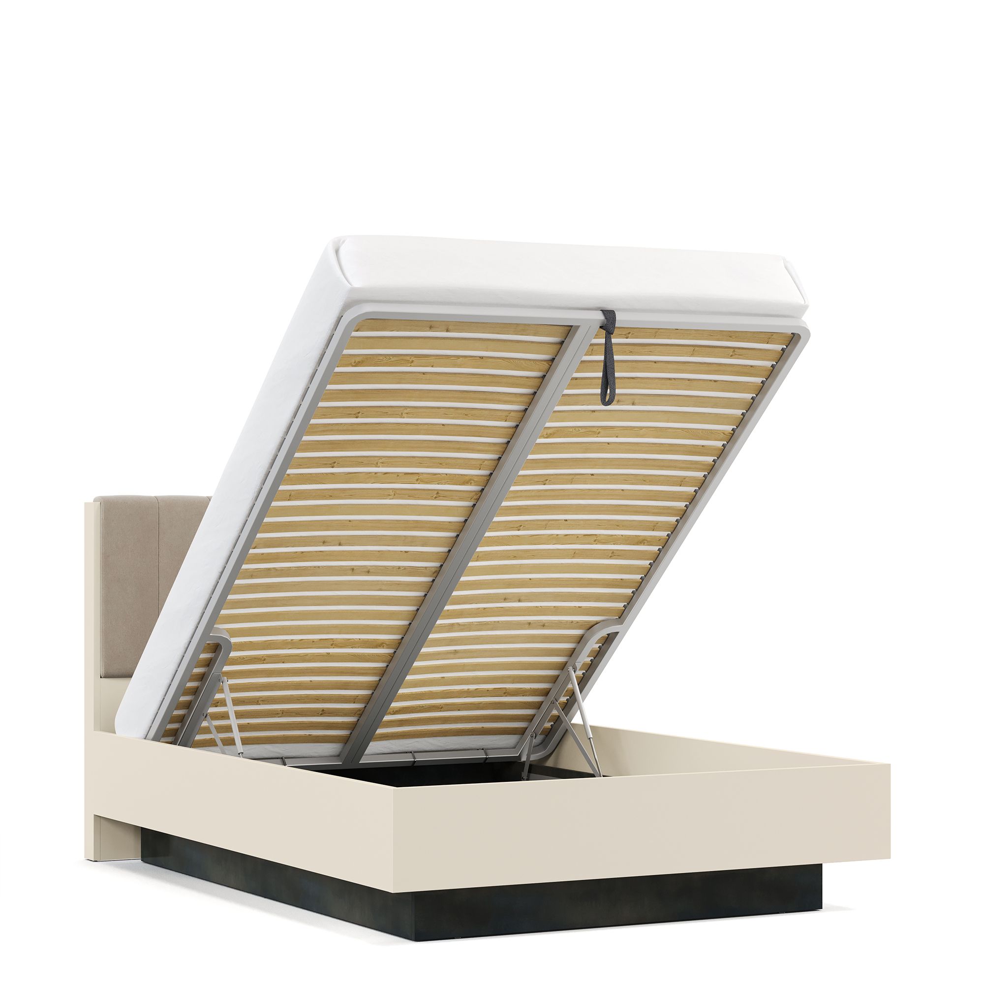 Дополнительное место для хранения создается за счет наличия у кроватей вместительного бельевого ящика, оснащенного надежным подъемным механизмом. Внешняя поверхность элемента выполнена в отделке текстурой Galaxy, а внутренняя – декором Шенилл, воспроизводящим рисунок плетения натуральной ткани.