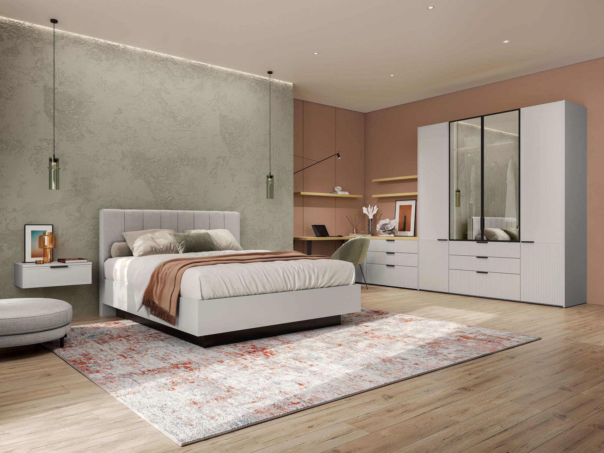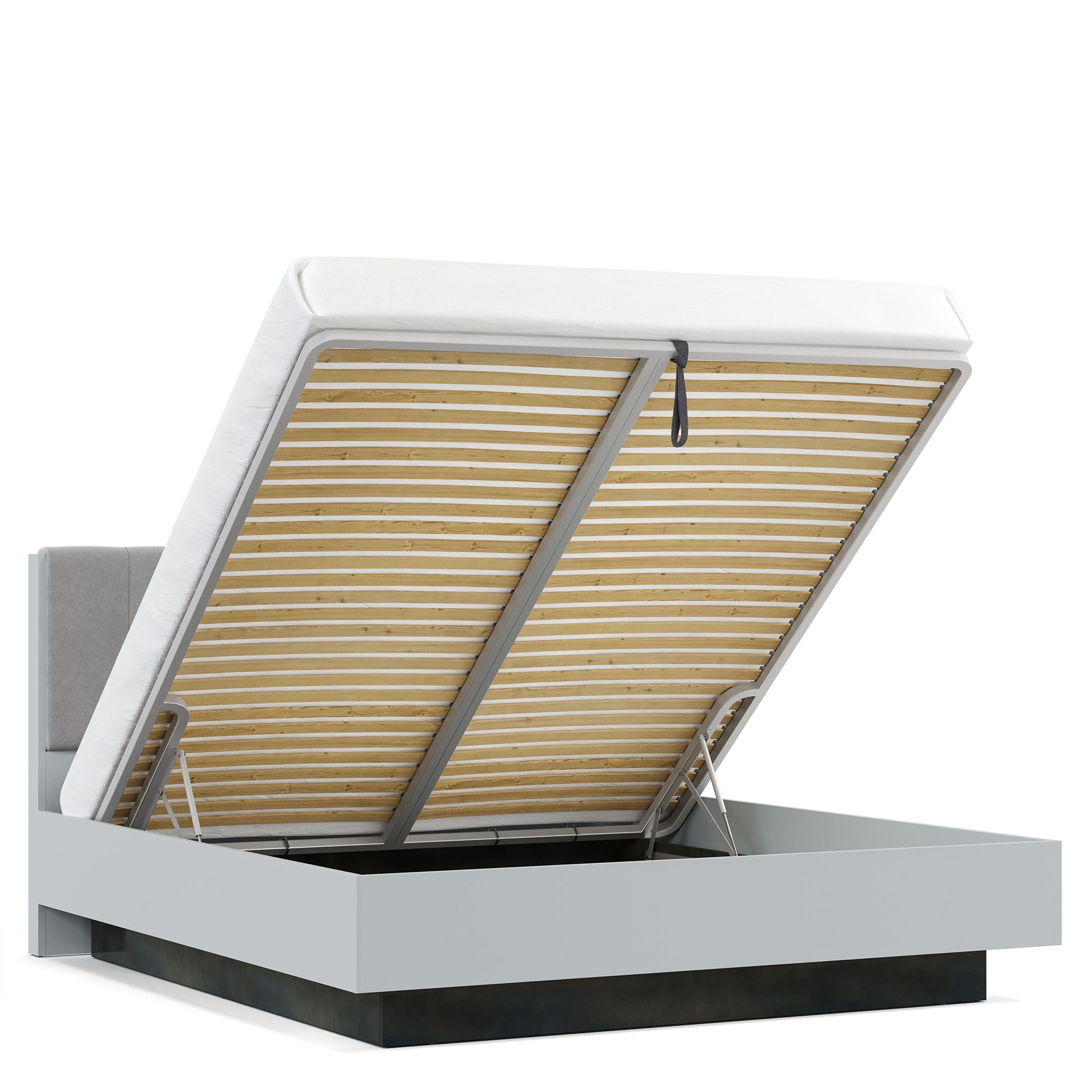 Дополнительное место для хранения создается за счет наличия у кроватей вместительного бельевого ящика, оснащенного надежным подъемным механизмом. Внешняя поверхность элемента выполнена в отделке текстурой Galaxy, а внутренняя – декором Шенилл, воспроизводящим рисунок плетения натуральной ткани.