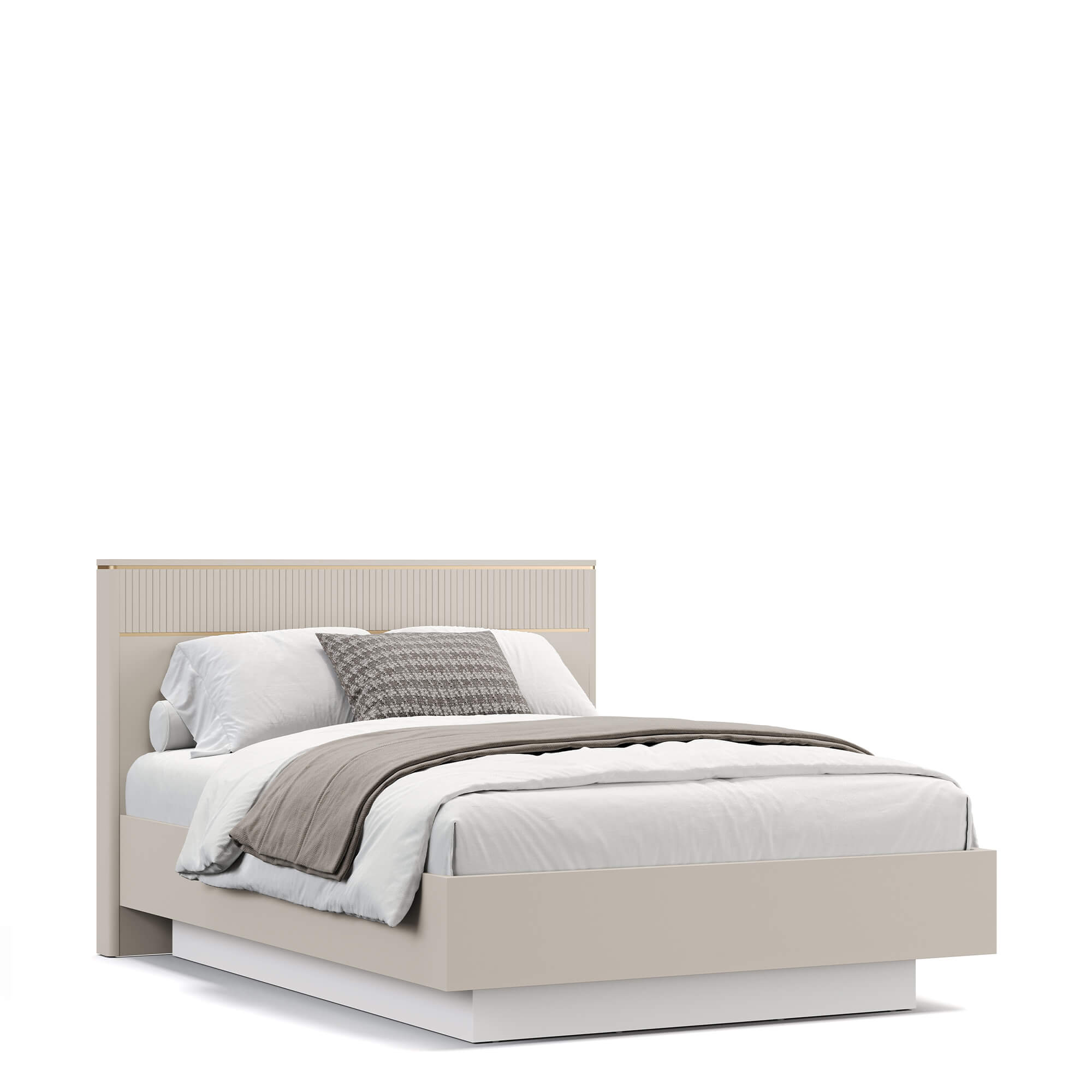 Головная спинка кровати декорирована вертикальной фрезеровкой и изящным молдингом в благородном оттенке матового золота, который гармонирует с остальными элементами спальни. Сочетание белой эмали и золотой вставки придает дизайну респектабельность.