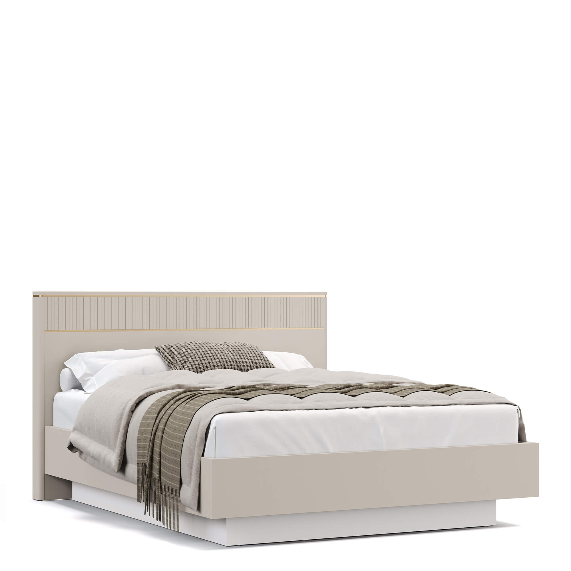 Головная спинка кровати декорирована вертикальной фрезеровкой и изящным молдингом в благородном оттенке матового золота, который гармонирует с остальными элементами спальни. Сочетание белой эмали и золотой вставки придает дизайну респектабельность.