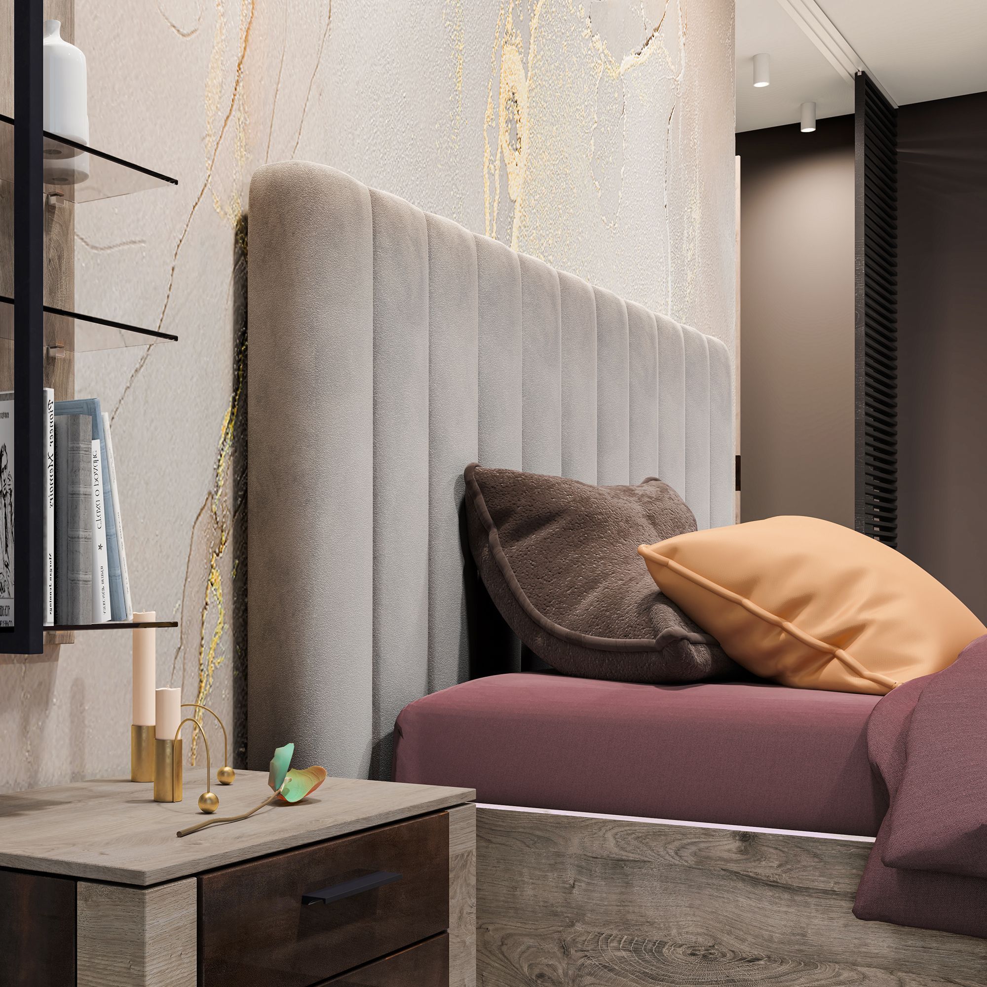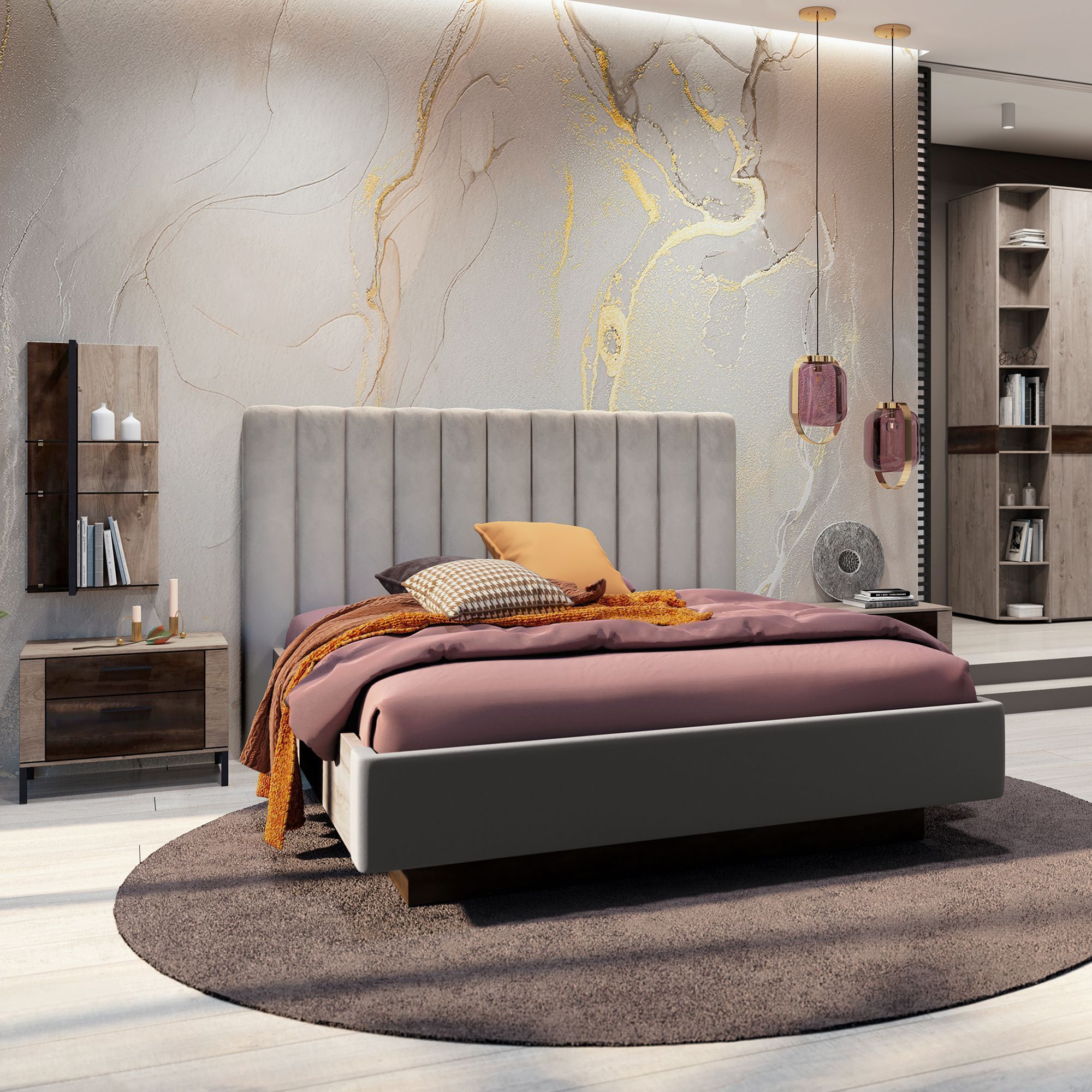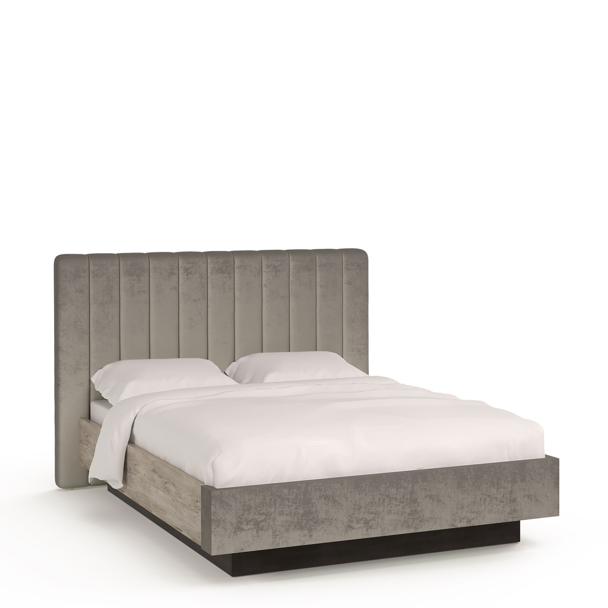 Рельефное высокое изголовье и ножная спинка кровати представляют собой мягкие элементы, изготовленные с использованием велюровой ткани базового оттенка Elephant.