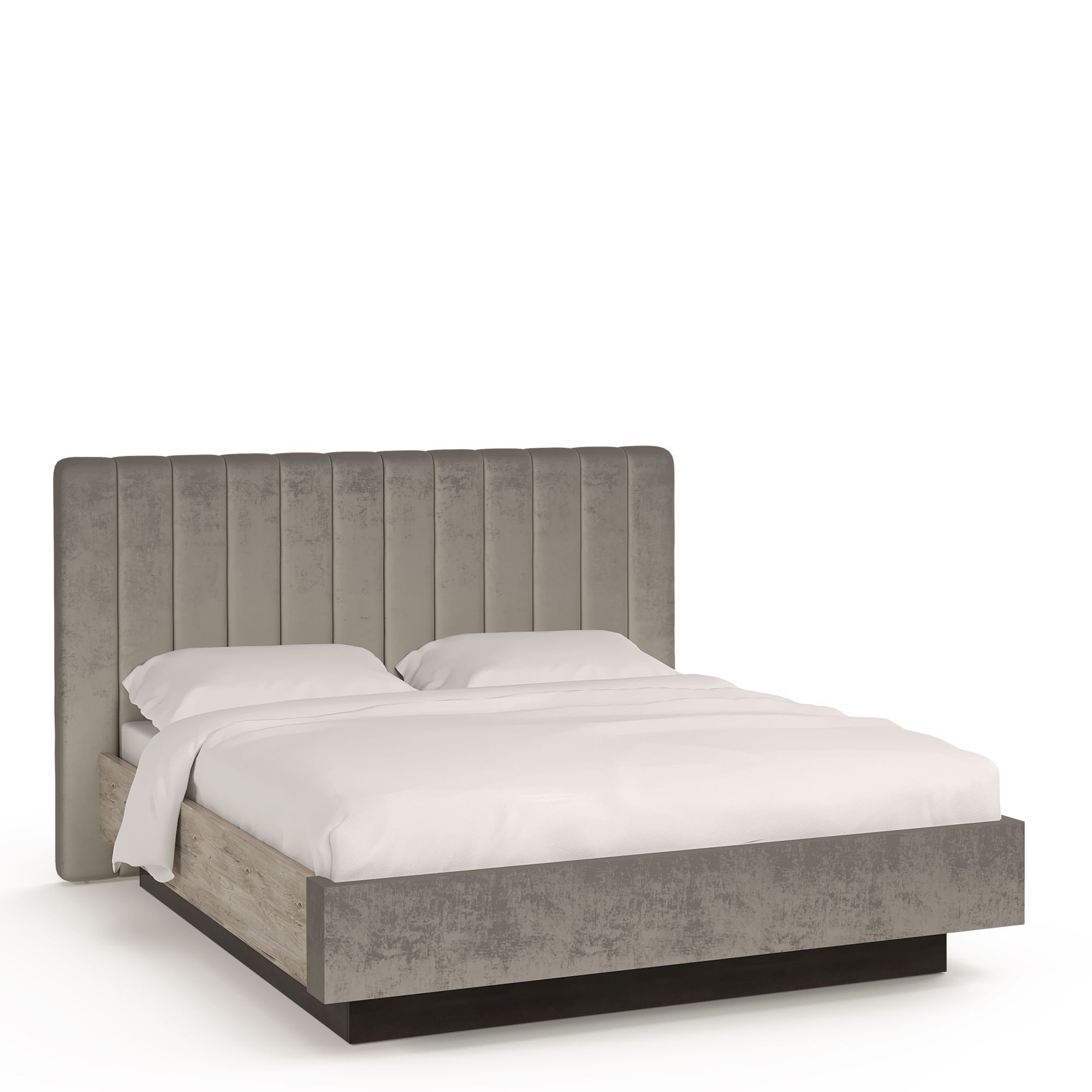 Рельефное высокое изголовье и ножная спинка кровати представляют собой мягкие элементы, изготовленные с использованием велюровой ткани базового оттенка Elephant.