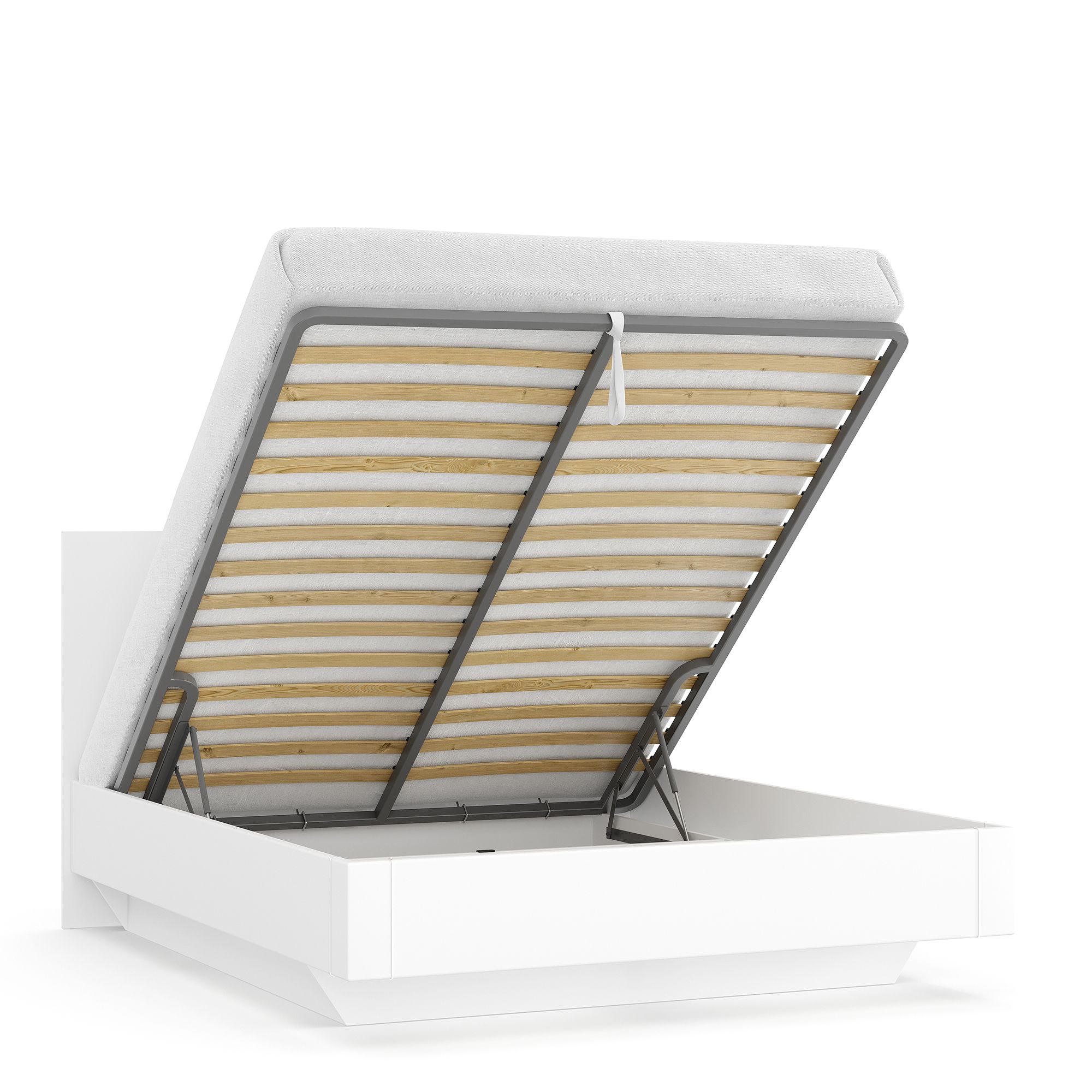Бельевой ящик модели имеет меньшую площадь, чем спальное место. Такое исполнение создает необычный визуальный эффект, как будто кровать парит в воздухе. Кроме того, конструкция повышает безопасность: к кровати можно подходить с любой стороны, не опасаясь ушибить пальцы ног.
