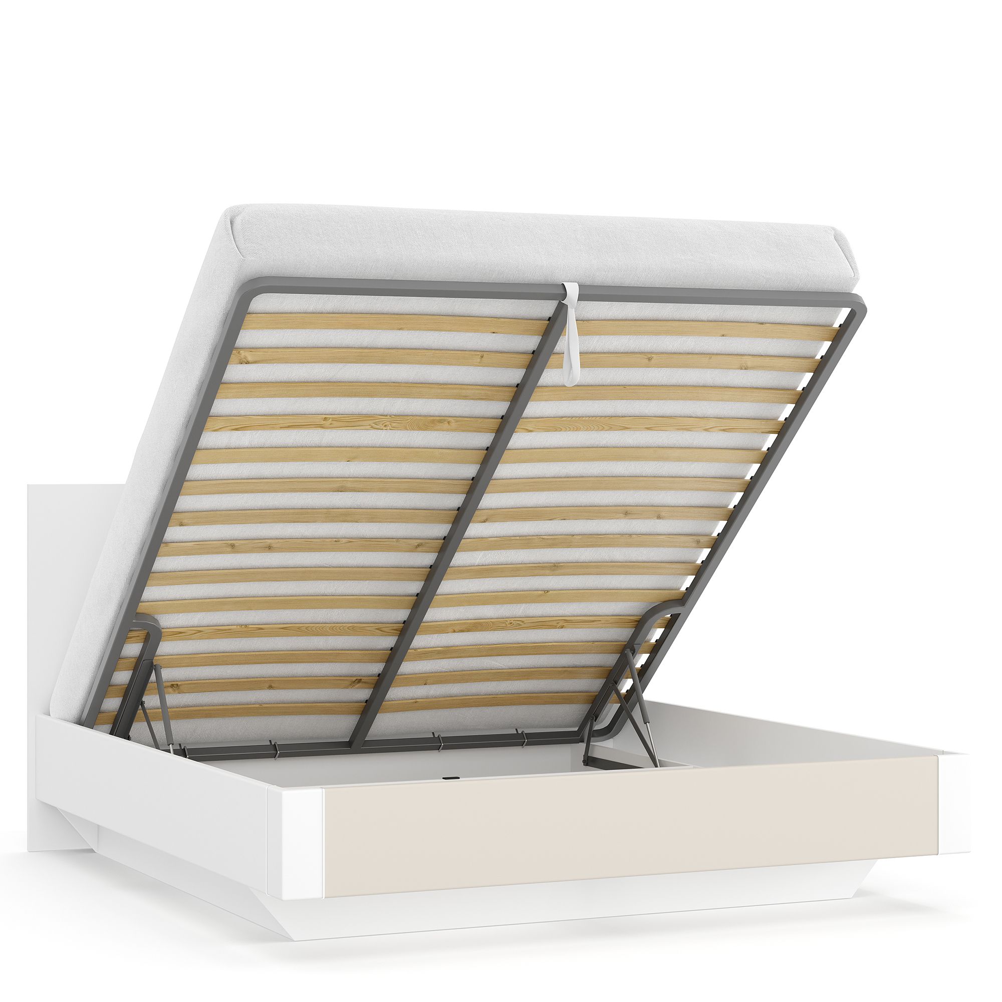 Бельевой ящик кровати оснащается качественным и надежным подъемным механизмом, который работает легко и плавно и рассчитан на долгие годы ежедневной интенсивной эксплуатации.
