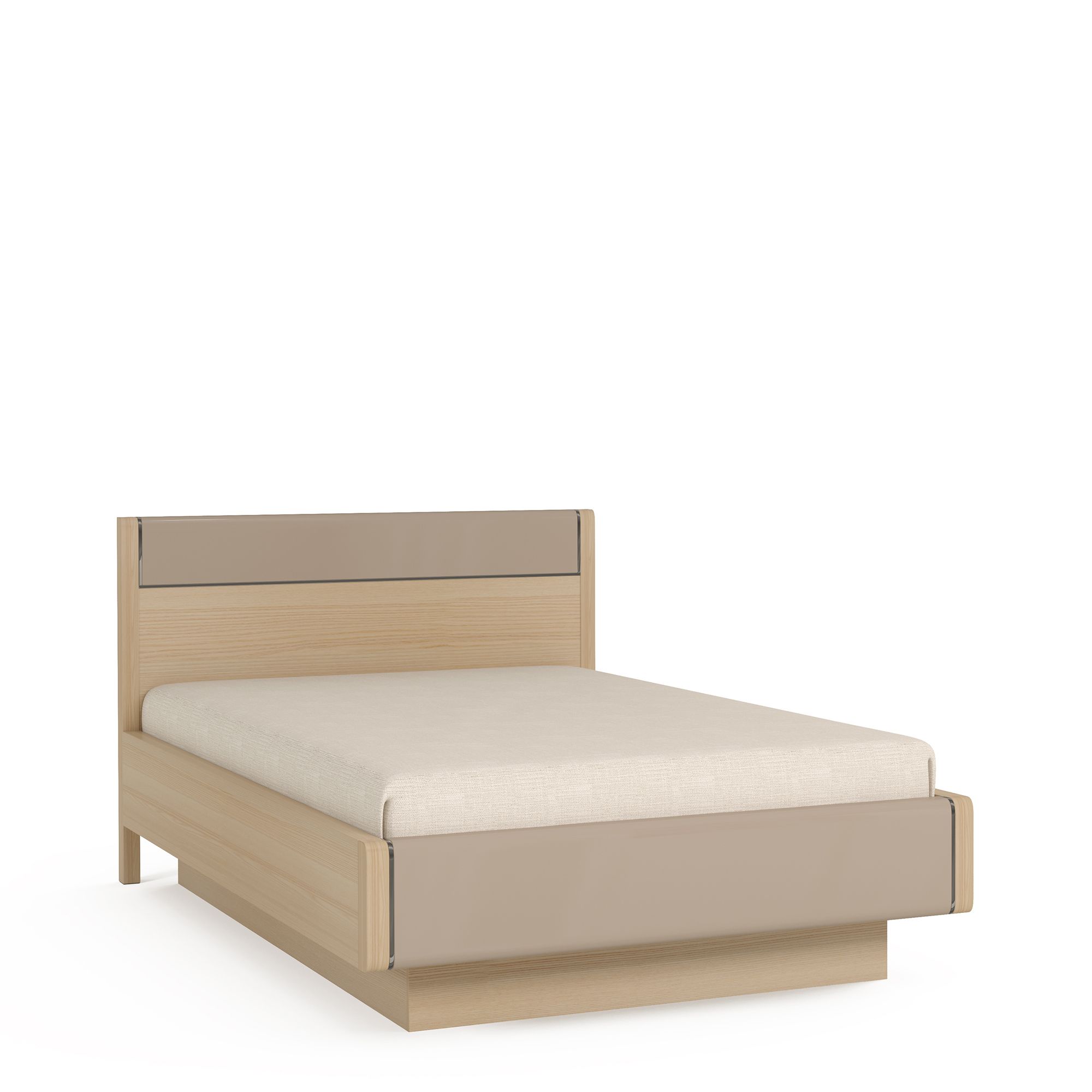 Кровать оснащена стильным высоким изголовьем с глянцевой вставкой и изящным металлическим декором.