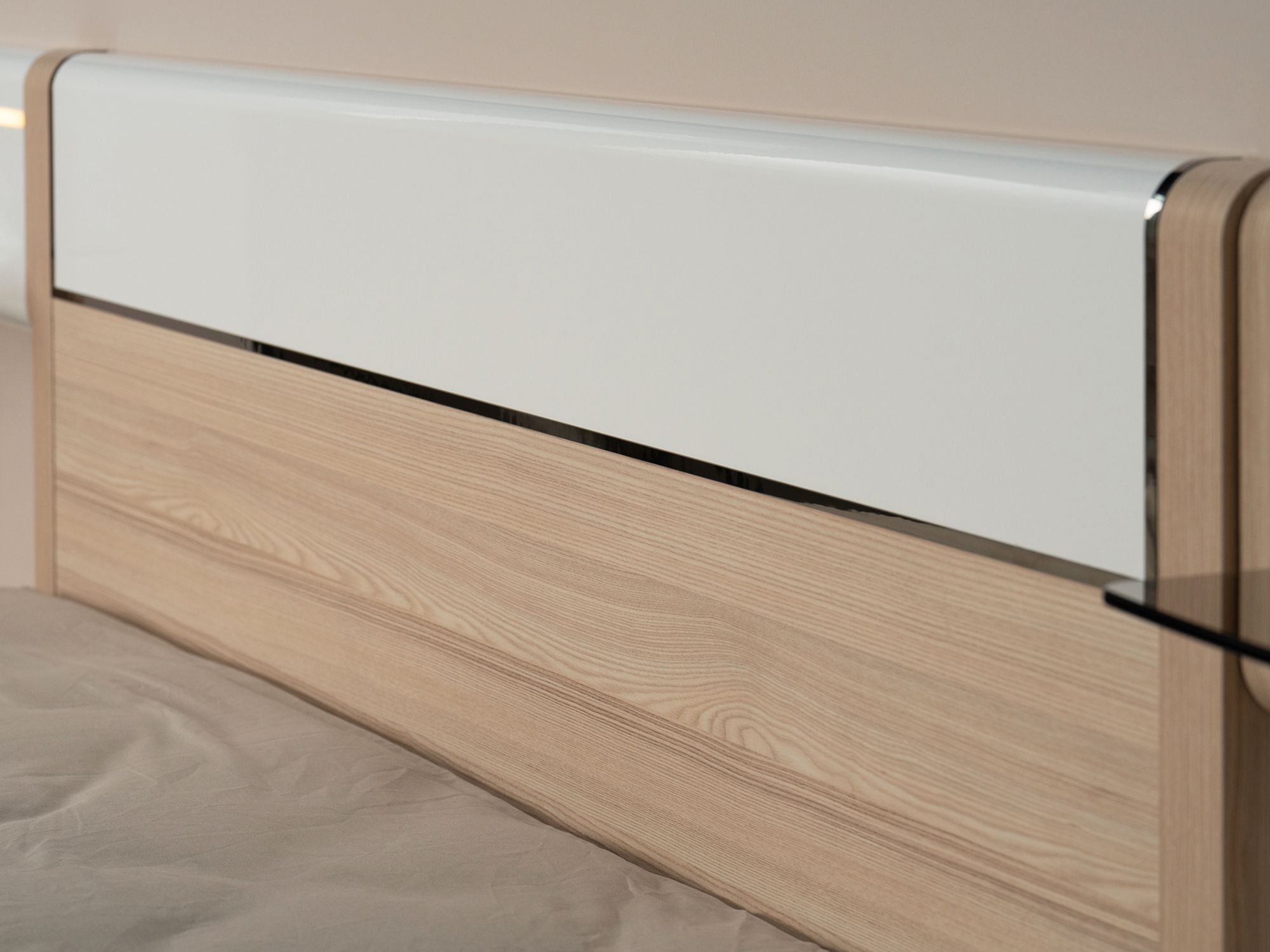 Дизайн двуспальной кровати ESTE построен на сочетании древесной текстуры и глянцевых элементов со скругленными линиями, выполненных по технологии окутывания. Особый стиль ему придают изящные титановые молдинги. Бельевой ящик, оснащенный надежным подъемным механизмом европейского производства, не уступает по вместительности полноценному двухдверному шкафу. Ортопедическая решетка с подъемным механизмом и дополнительной амортизацией входит в комплектацию кровати.