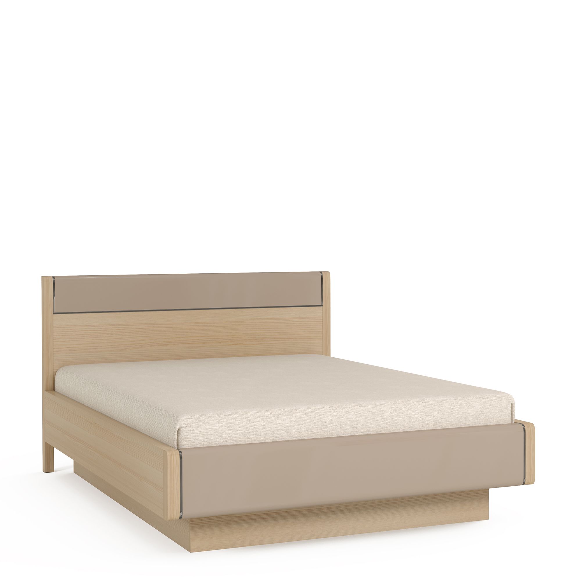 Кровать оснащена стильным высоким изголовьем с глянцевой вставкой и изящным металлическим декором.