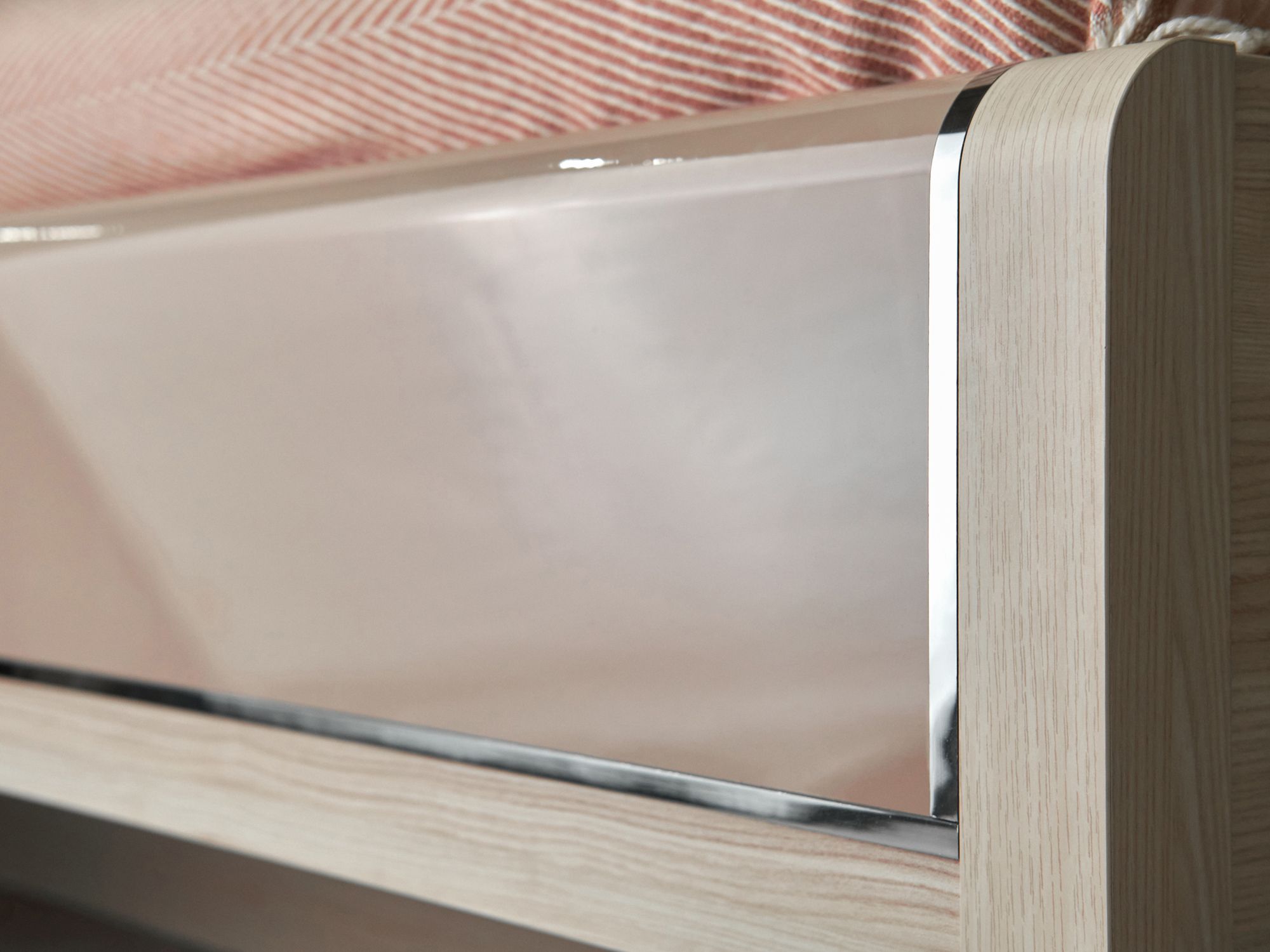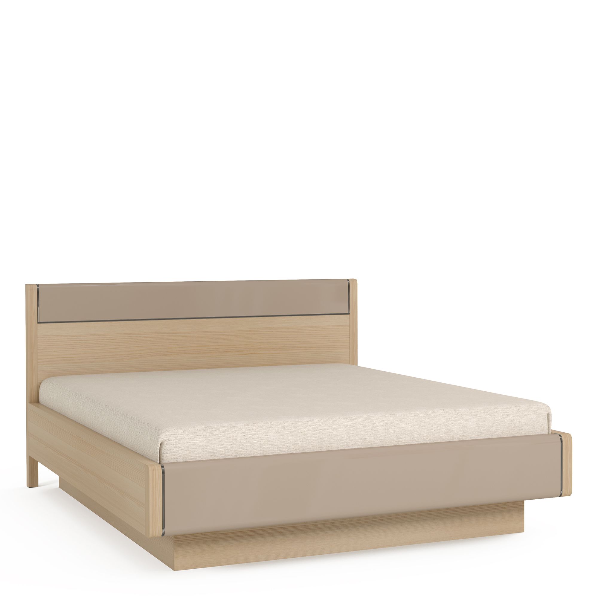 Кровать оснащена стильным высоким изголовьем с глянцевой вставкой и изящным металлическим декором.