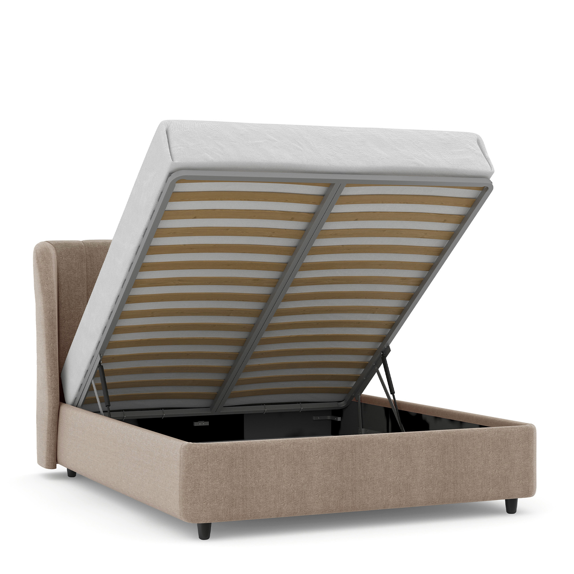Механизм на газовых лифтах надежен и безопасен. Он плавно и бесшумно поднимает матрас, позволяя открывать ящик без особых усилий. Нагрузка на подъемный механизм – до 120 кг. Можно использовать матрас высотой до 45 см.