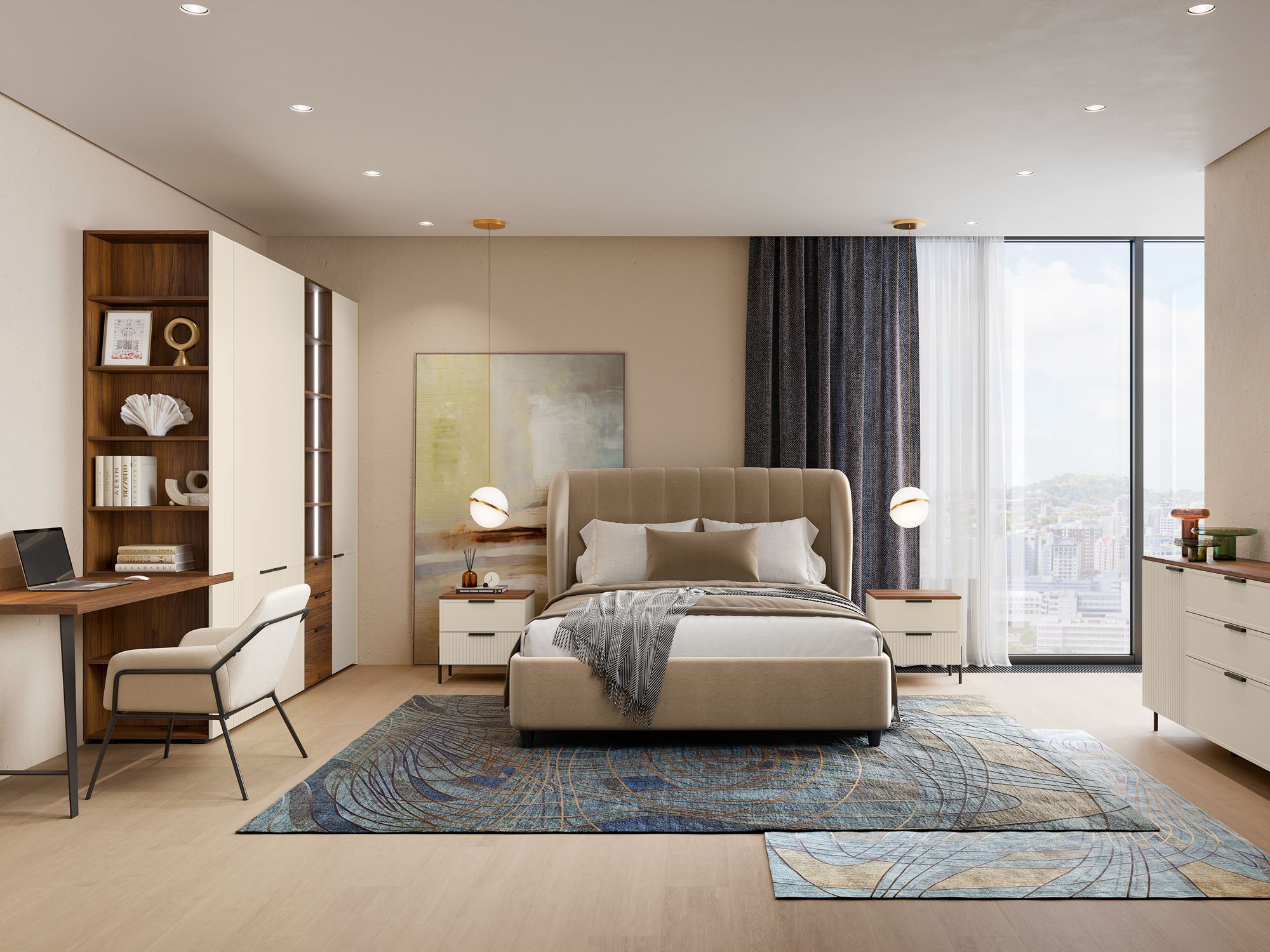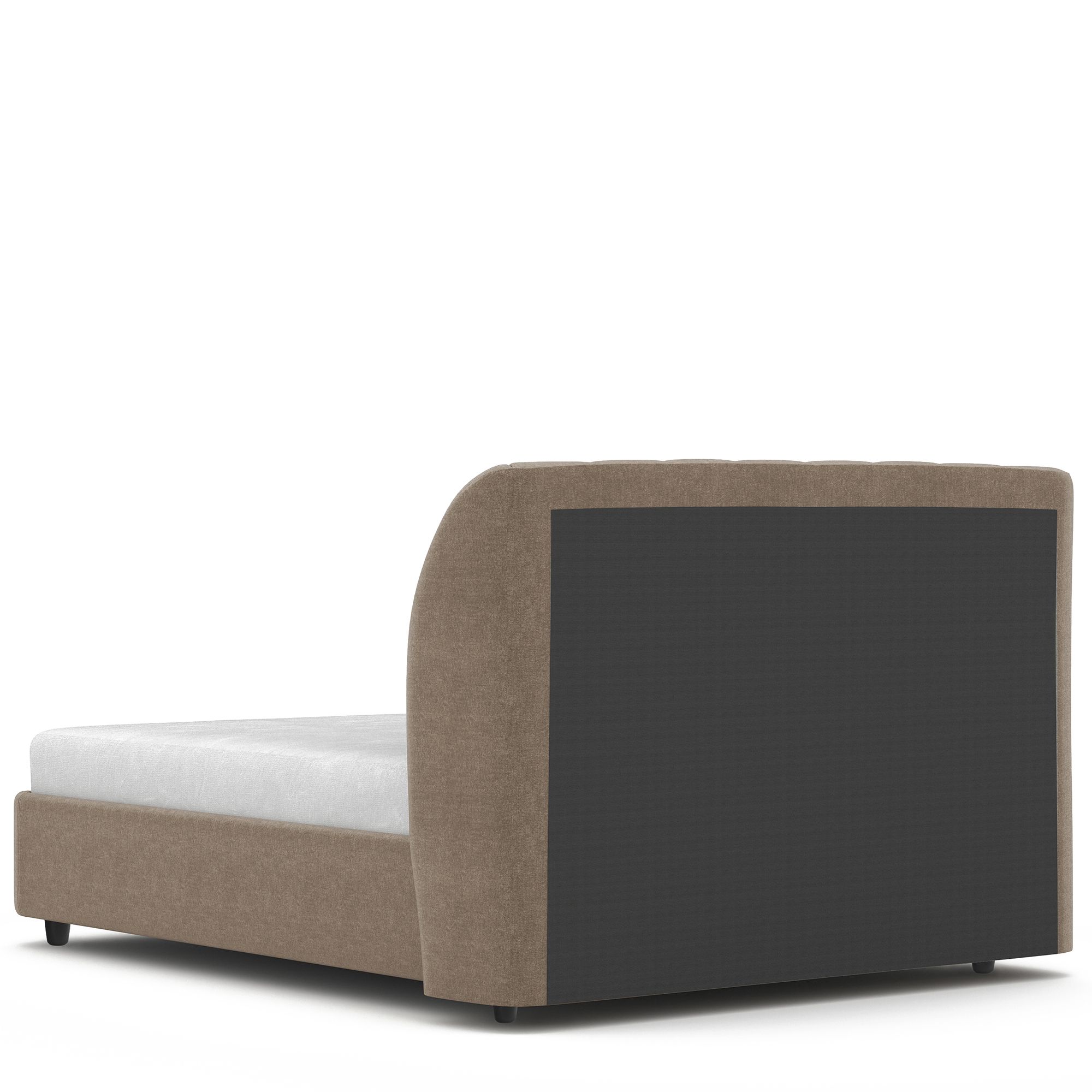 Благодаря мягкому наполнителю изголовья любители сериалов и чтения перед сном могут расположиться с комфортом. Строгая и лаконичная отделка в виде вертикальных утяжек визуально облегчает изголовье и делает его выше. Обивка кровати специально разработана по заказу бренда «Дятьково Design».