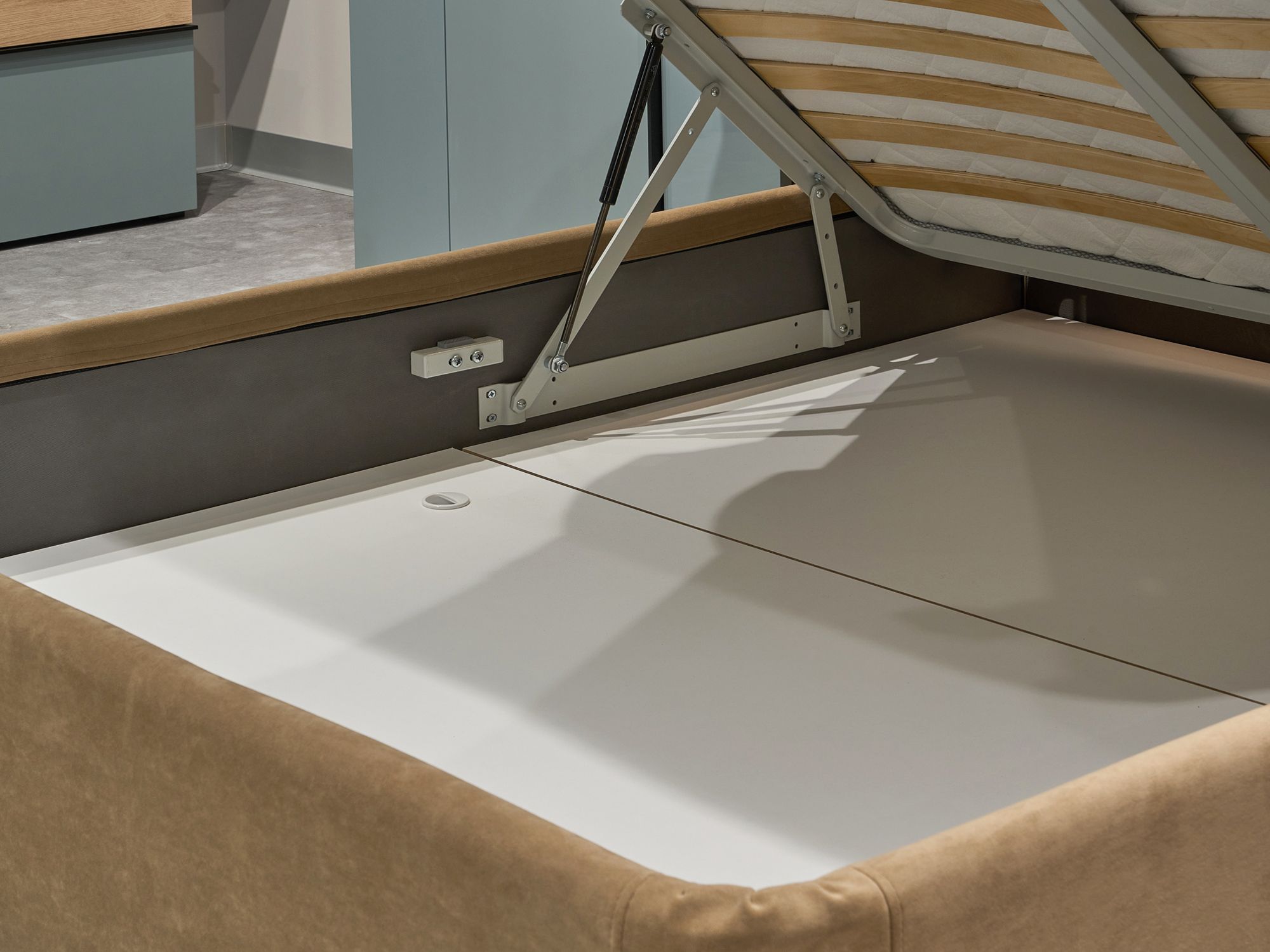 Вместительный короб внутри кровати подойдет для хранения подушек, белья и других вещей. В бельевом ящике нет перегородок – это позволяет использовать его, в том числе, для хранения длинных и крупногабаритных вещей.