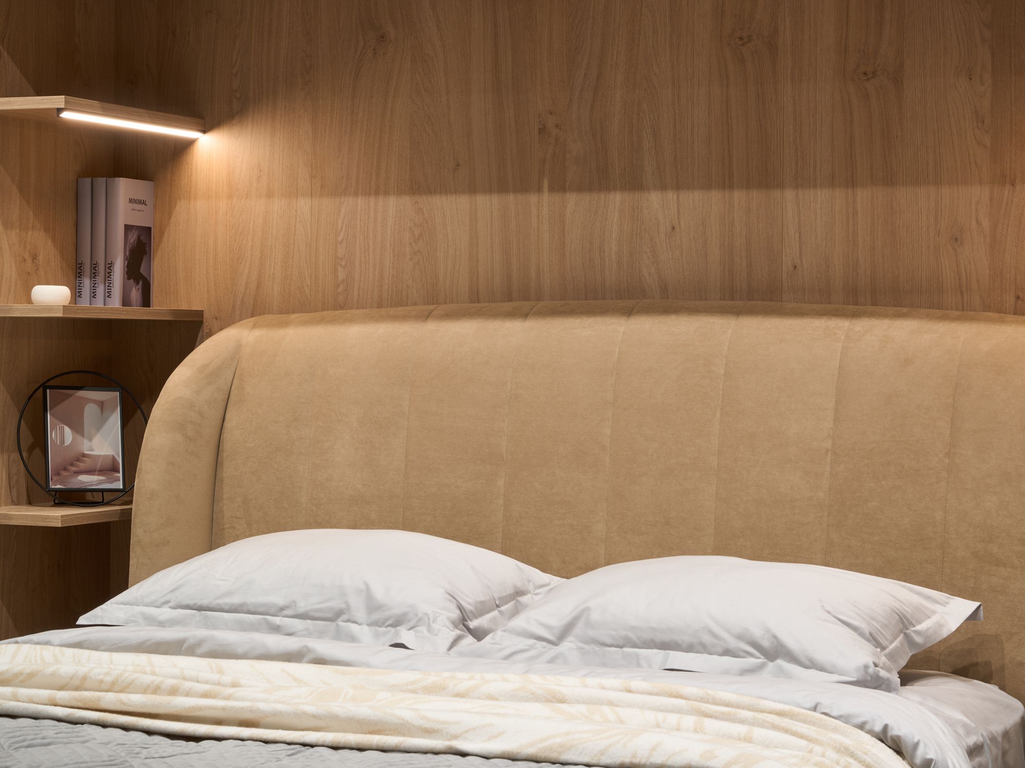 Благодаря мягкому наполнителю изголовья любители сериалов и чтения перед сном могут расположиться с комфортом. Строгая и лаконичная отделка в виде вертикальных утяжек визуально облегчает изголовье и делает его выше. Обивка кровати специально разработана по заказу бренда «Дятьково Design».